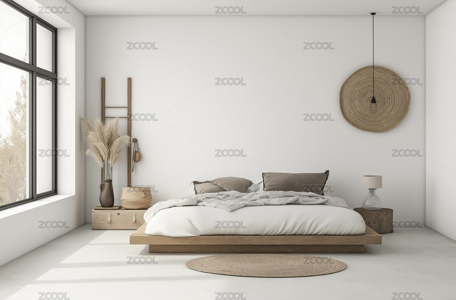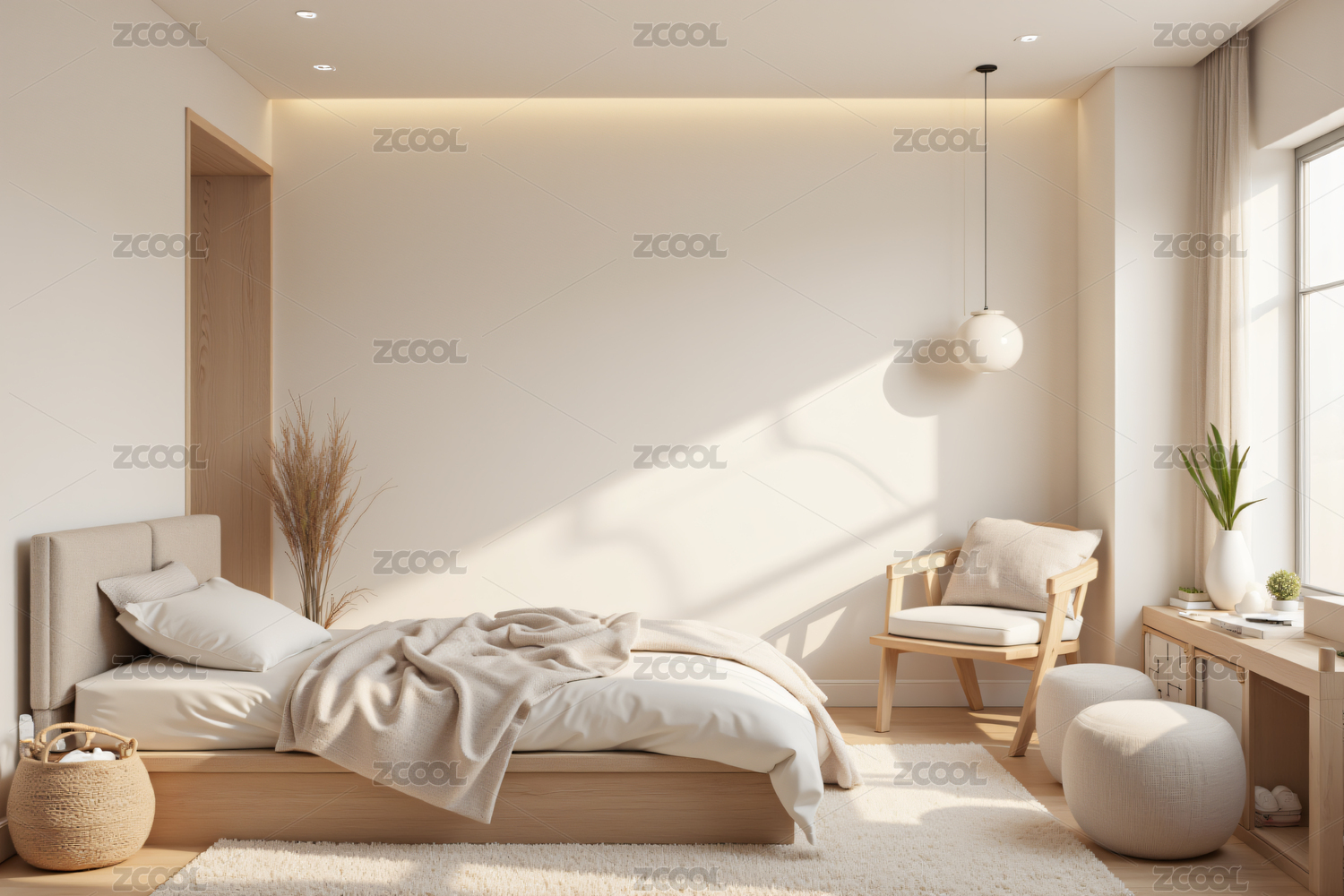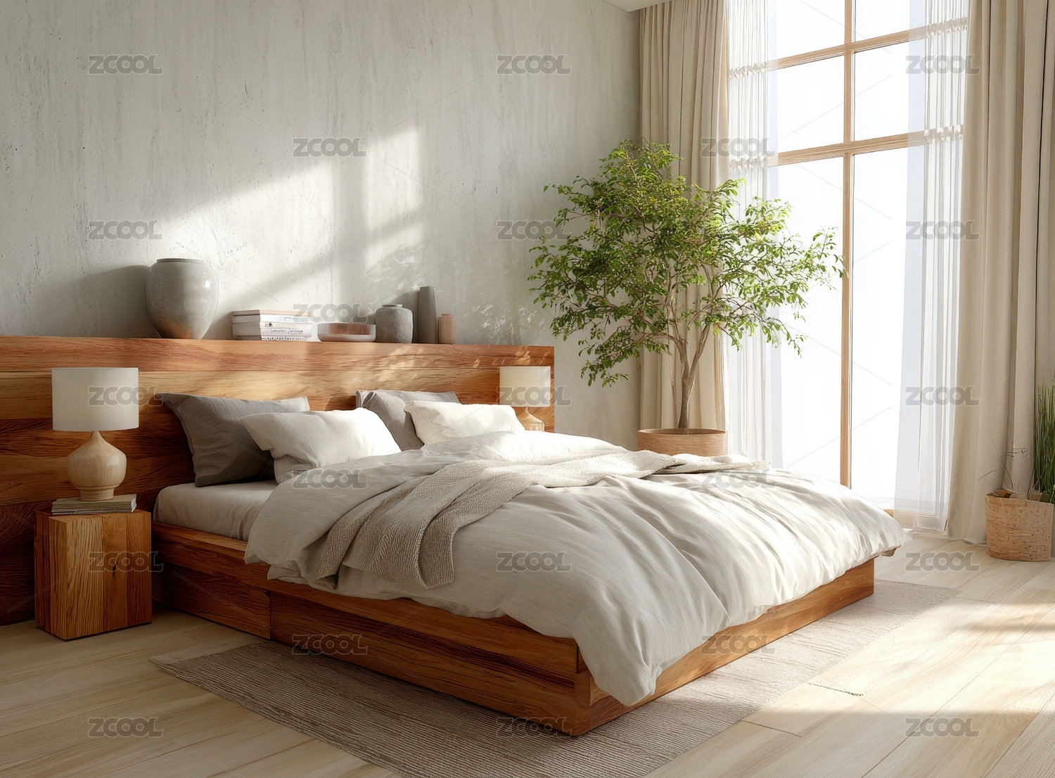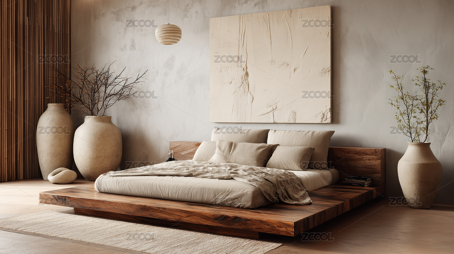 卧室,日式,极简,床铺,榻榻米,平台,木质,色调,米灰,墙面