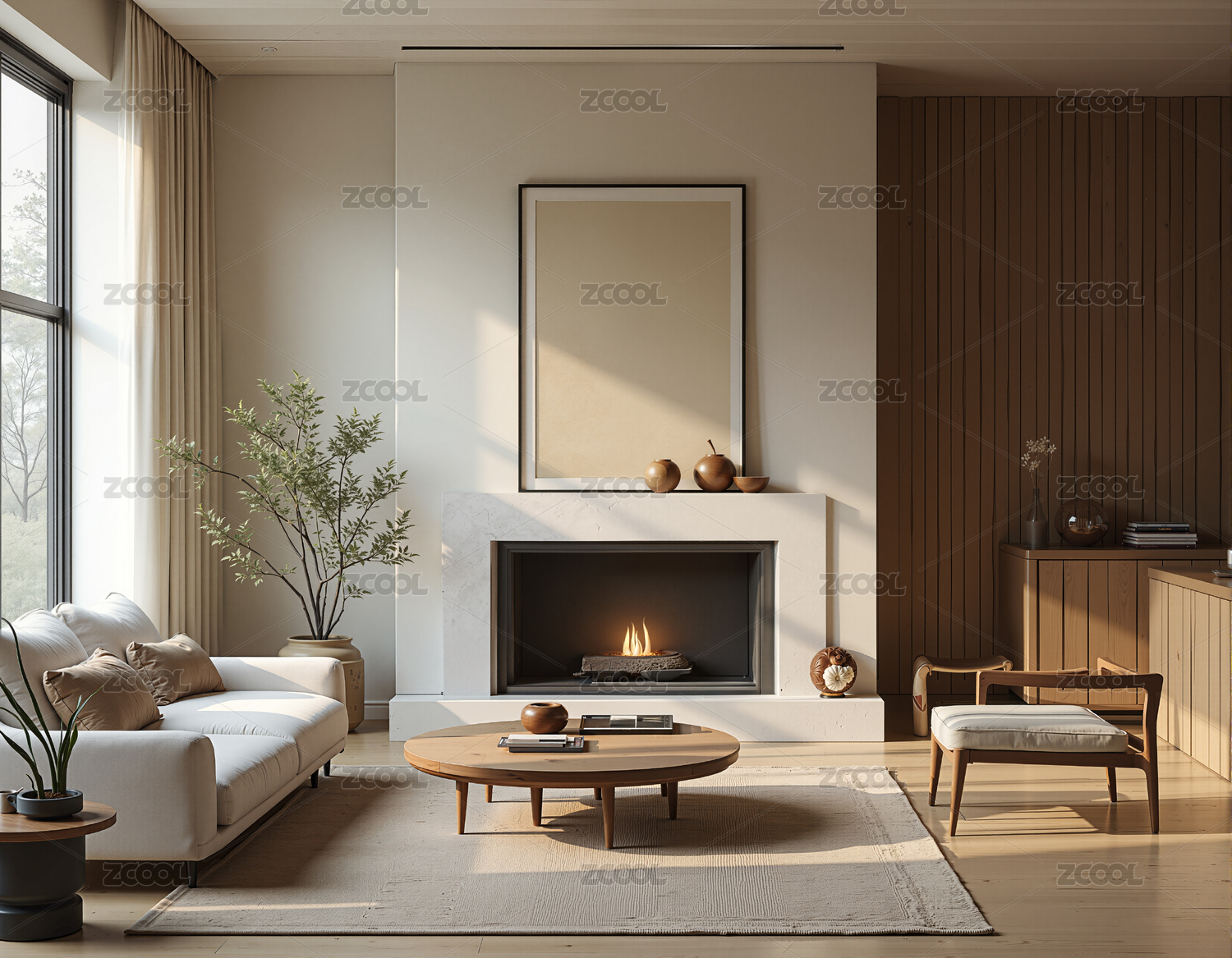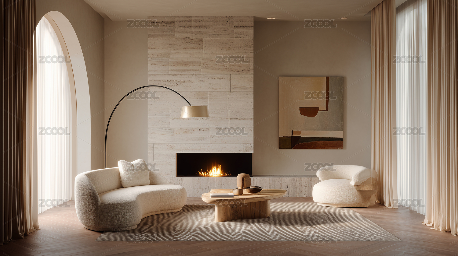 室内,高端,极简,沙发,米白,咖啡桌,橡木,曲线,壁炉,石材