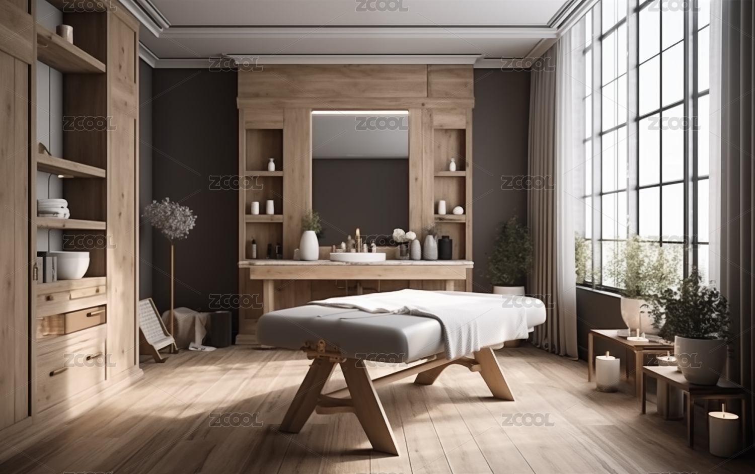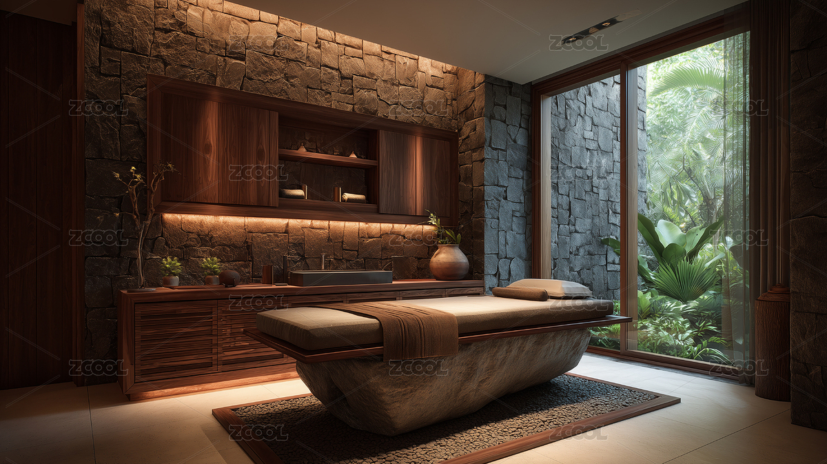 木柜,石墙,灯光,落地,绿植,窗景,床铺,暖光,按摩,宁静