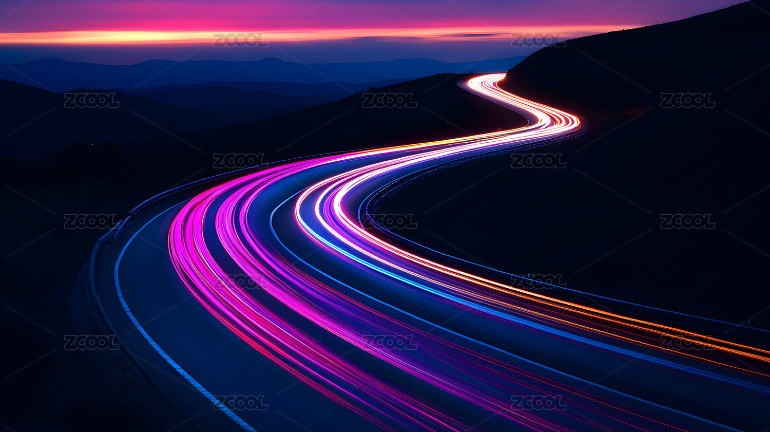 背景,温暖,黄色,渐变,天空,蜿蜒,公路,光轨,橙红,山丘