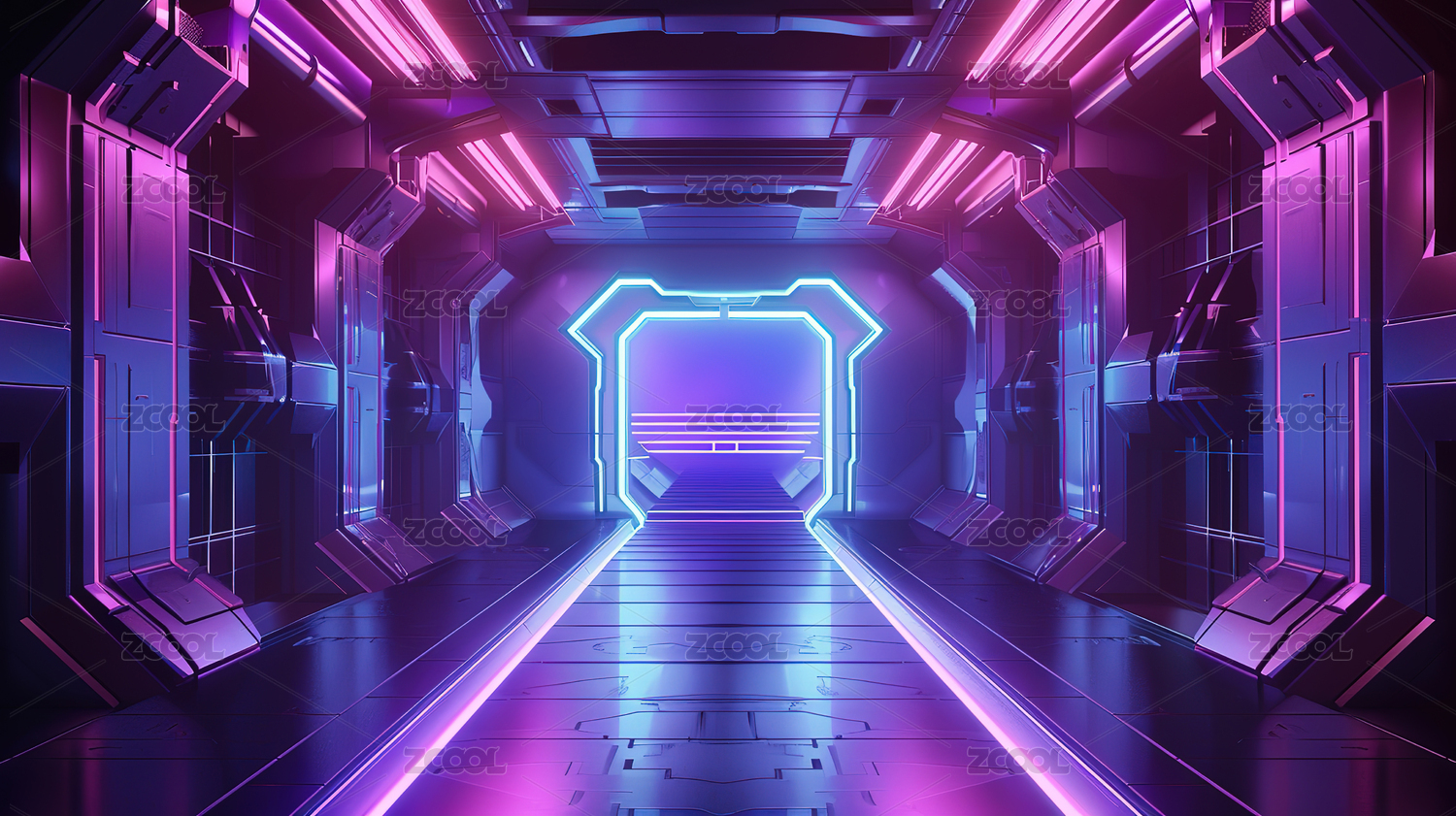 3D渲染的科幻延伸背景,几何隧道和霓虹灯
