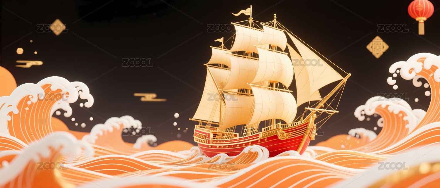 喜庆红底金浪帆船背景