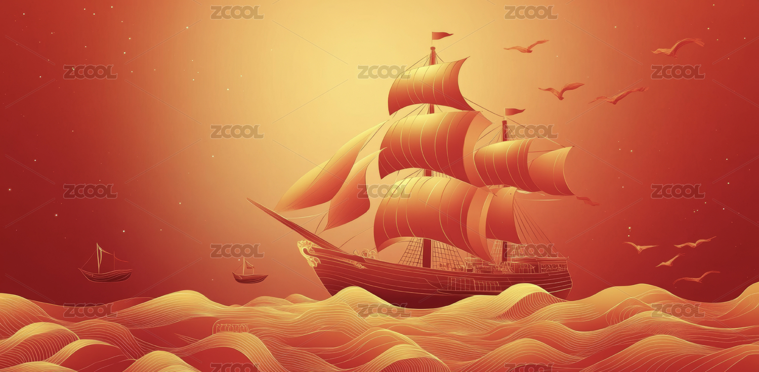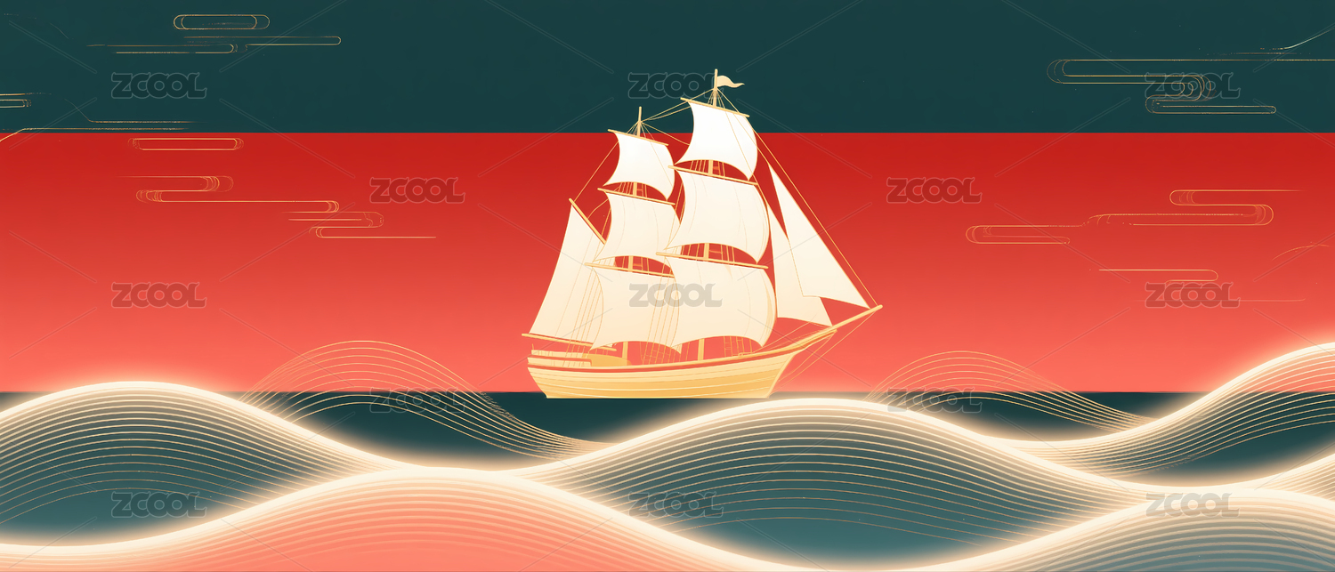 红色背景下的帆船航海图
