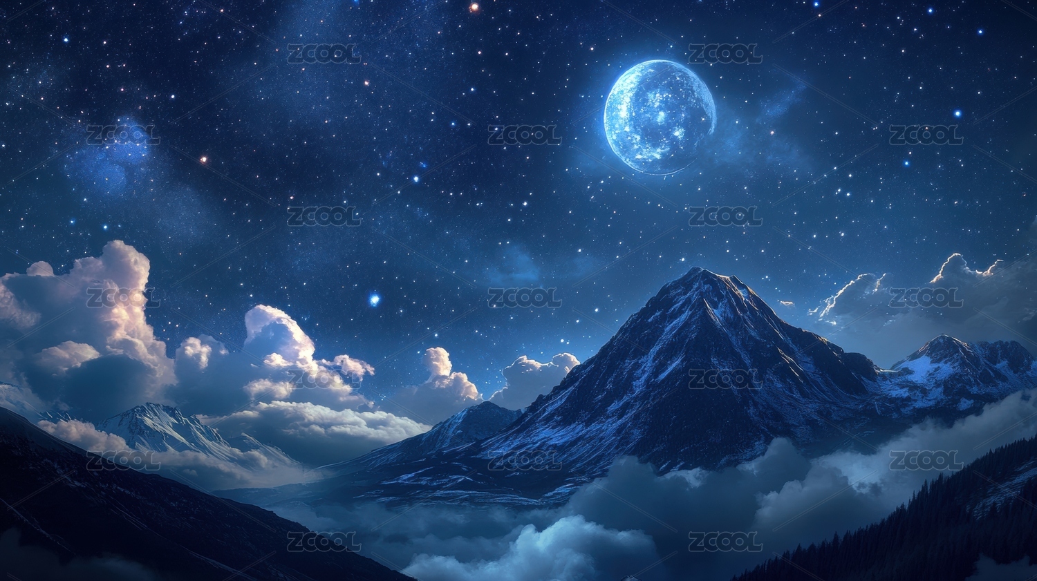 夜空,星星,岩石,瀑布,山峰,树木,溪流,月亮