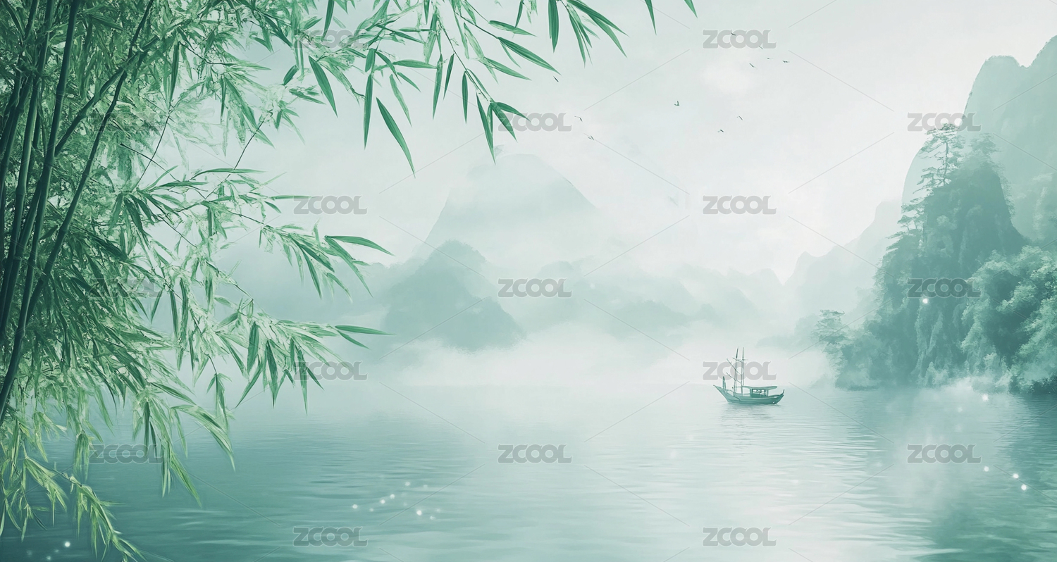 湖面,山水,竹影,小舟,薄雾,荷花,鸟儿,清晨