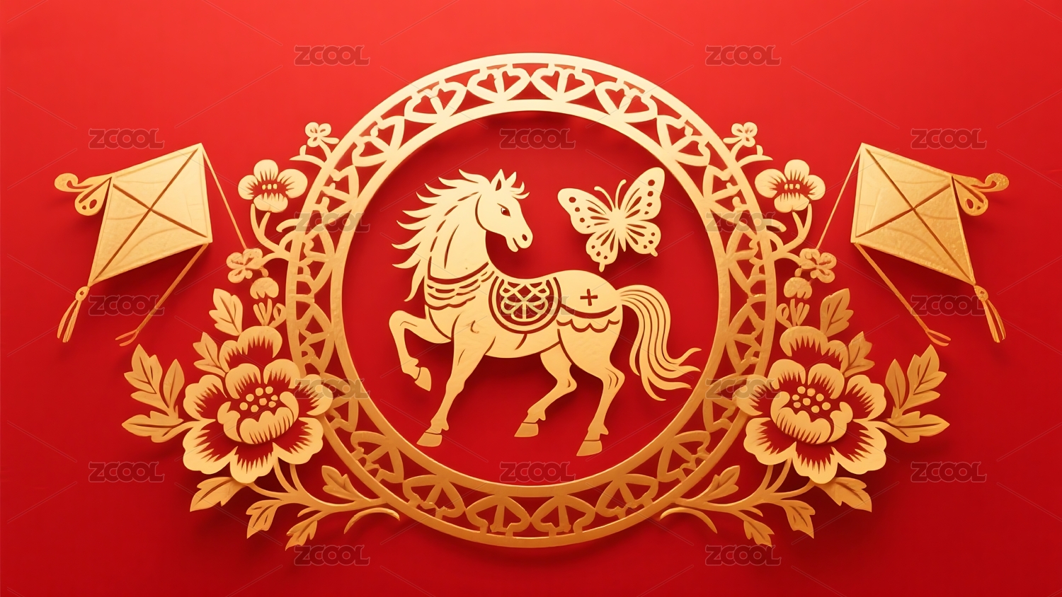 剪纸,马,红色,云纹,花朵,圆形,金元宝,装饰,传统,艺术