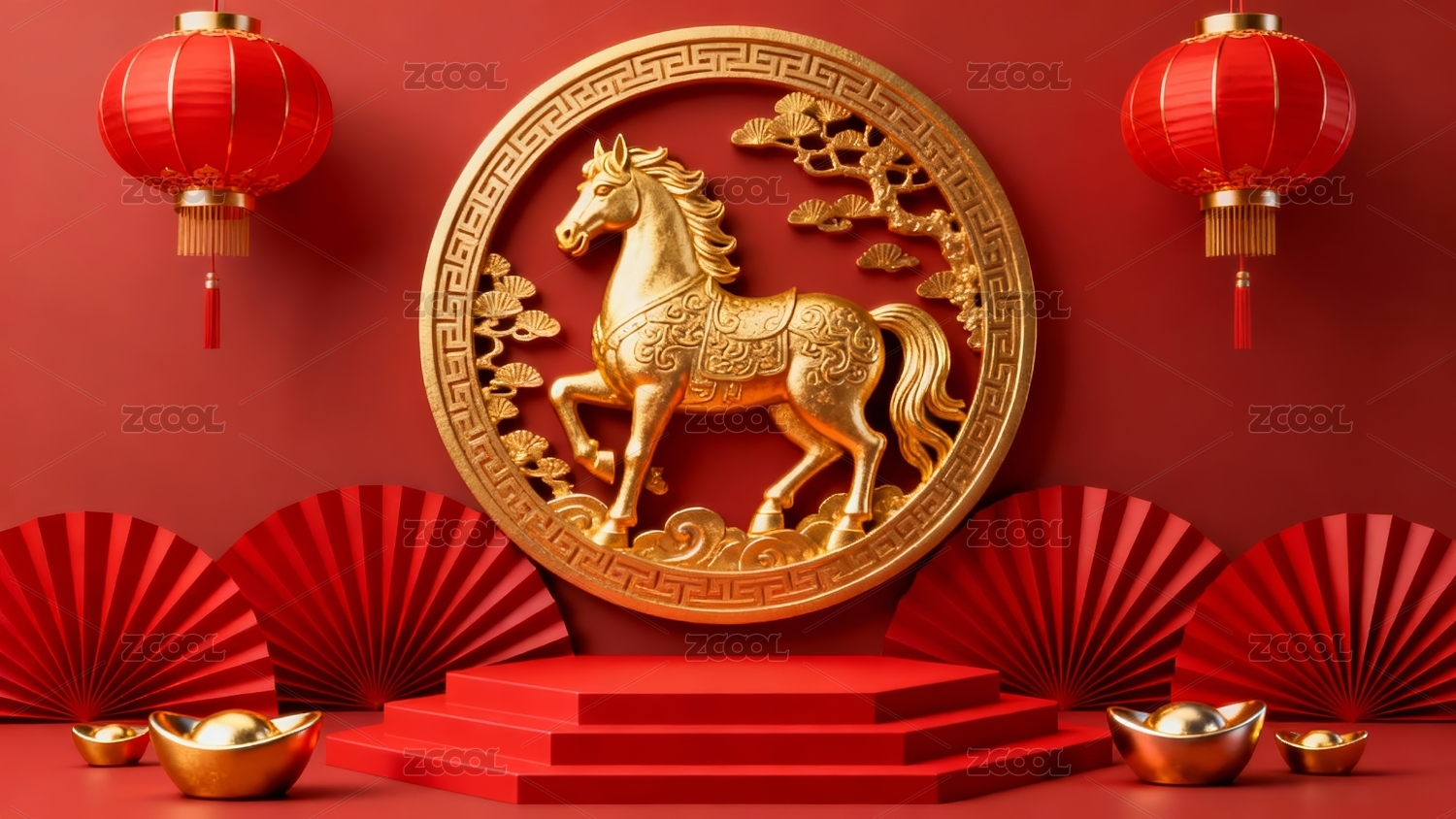八角框,金骏马,红边框,绿背景,红灯笼,梅花枝,中式风,金属感,古典美,装饰性