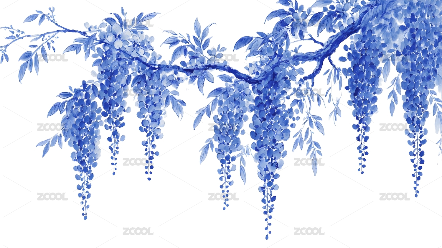 蓝花垂枝水墨风花卉图案