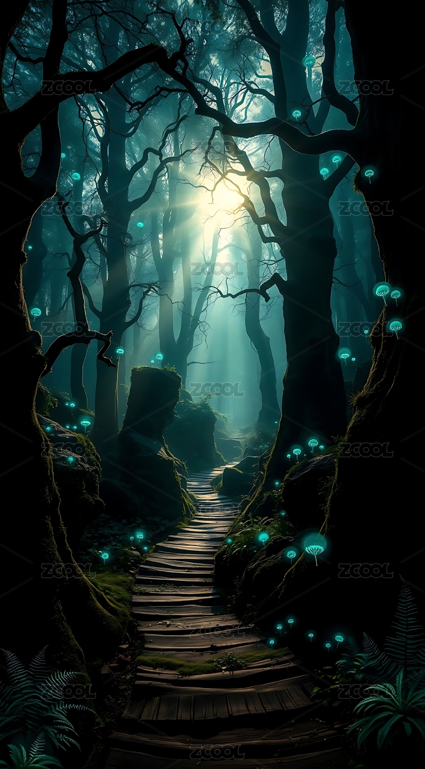幽深森林光芒照亮迷雾笼罩绿色小路