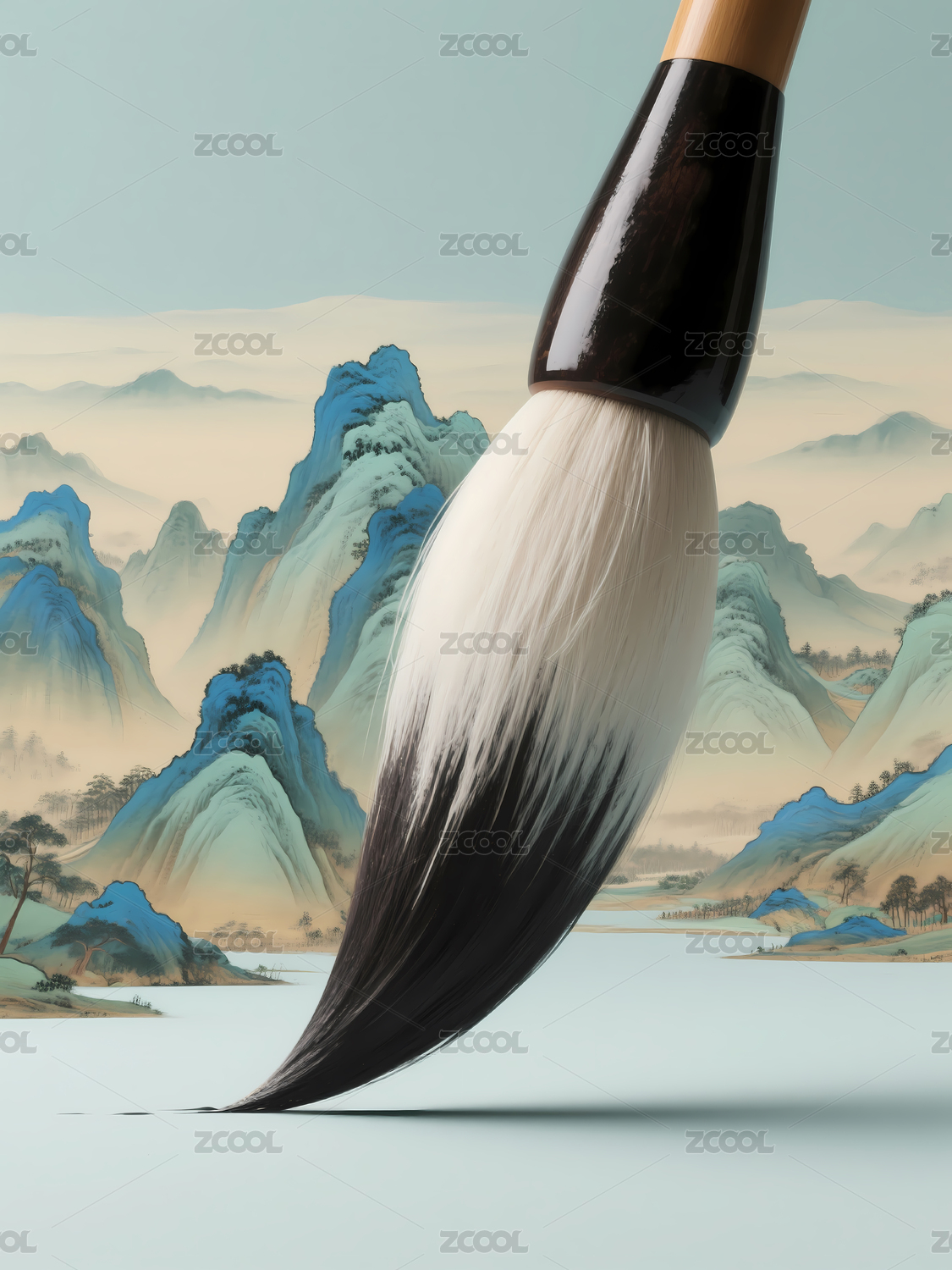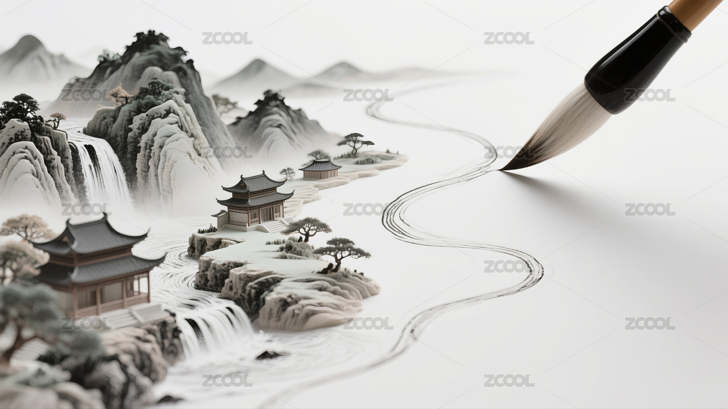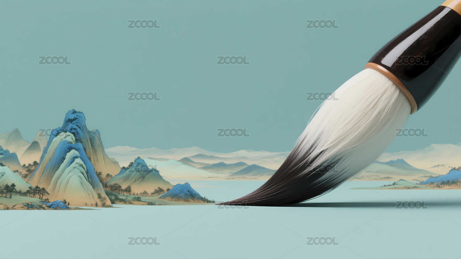 毛笔笔触于水墨山水间