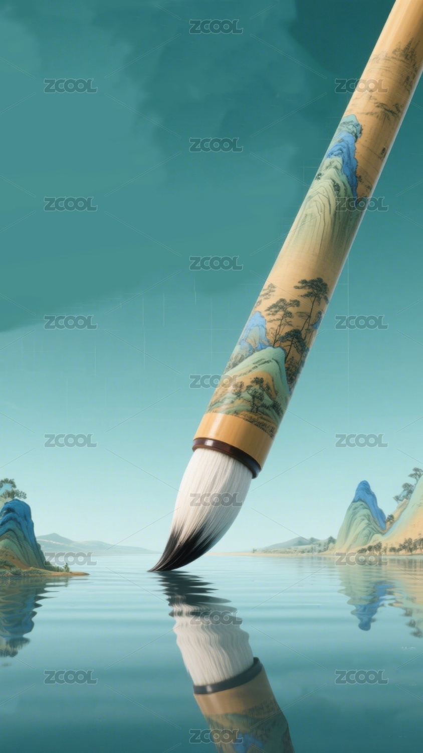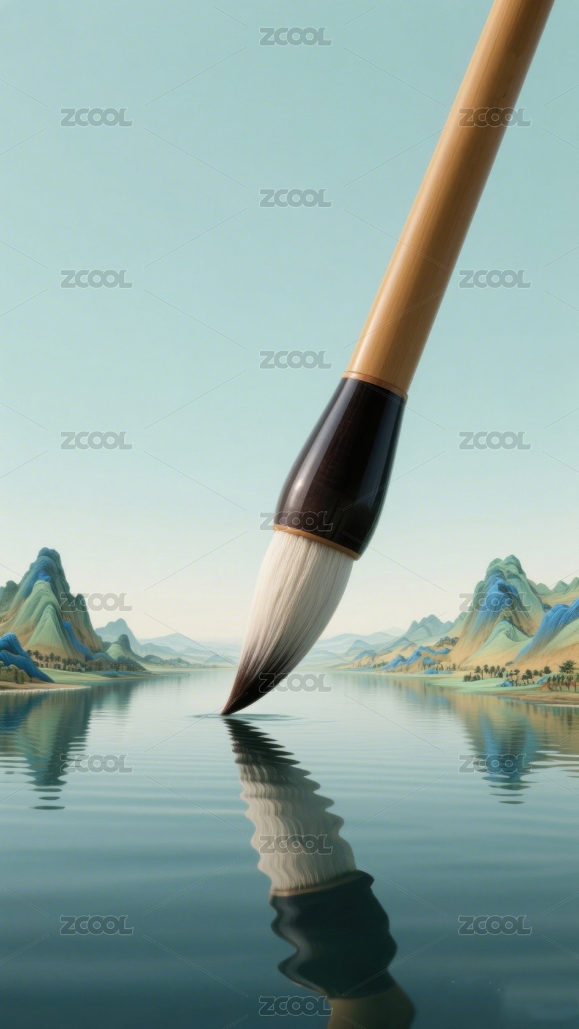 水墨画笔山川湖泊倒影