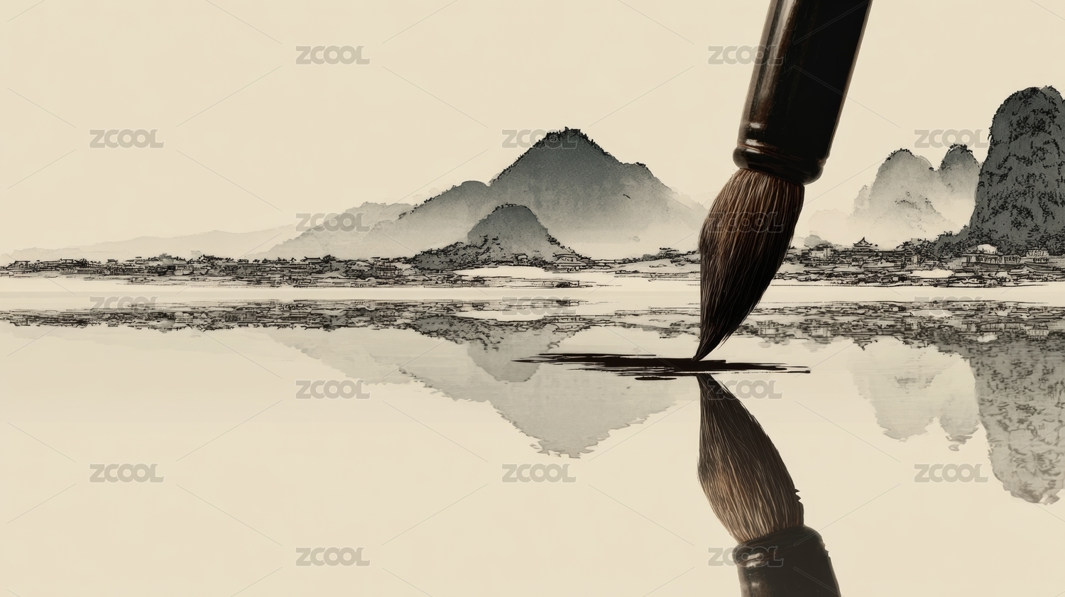 水墨画笔山水倒影