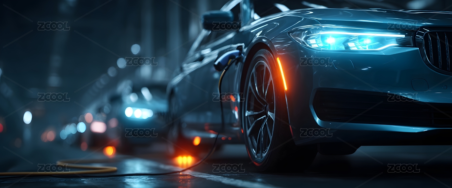 未来感,科技感,电动车,3D渲染,夜景图,光影美,高清图,插画风,充电中,充电桩
