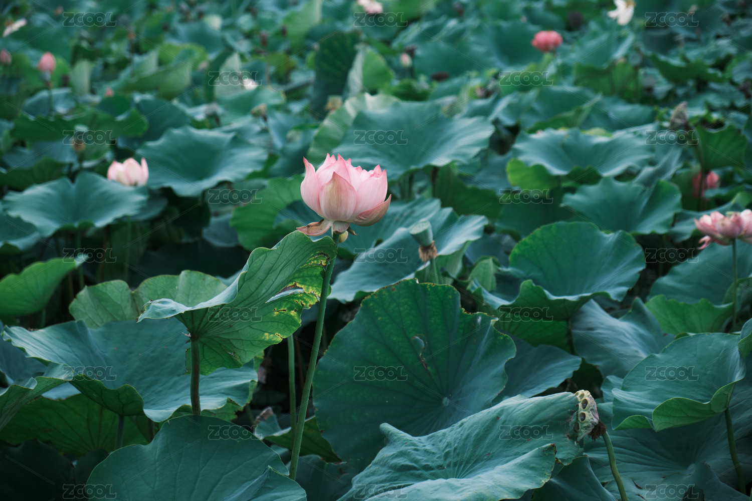 荷塘里美丽盛开的荷花花苞与大片荷叶背景素