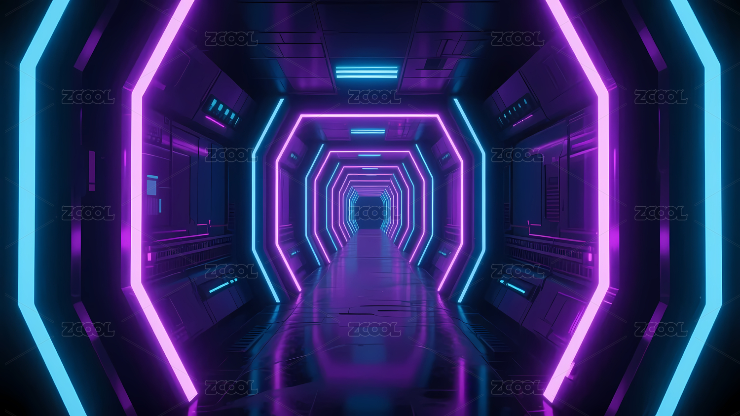 未来,走廊,蓝色,粉色,霓虹灯,发光,轮廓,深色,地面,墙壁