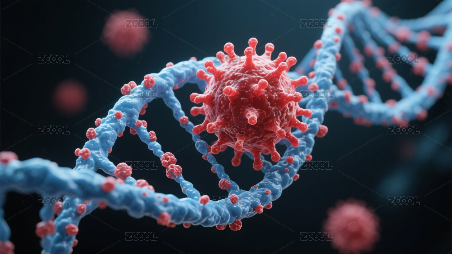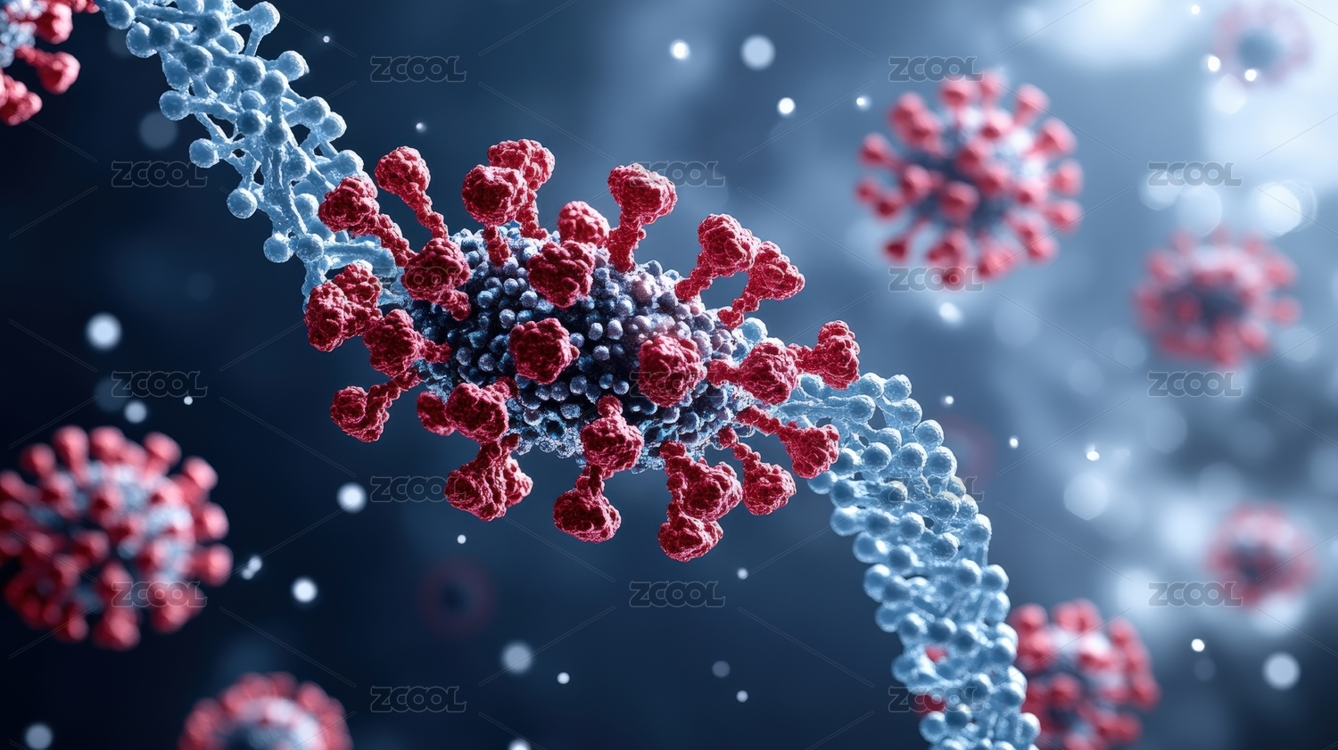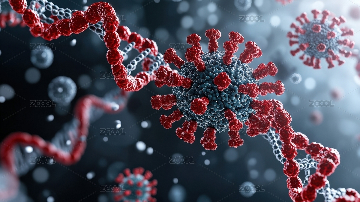 科技感DNA双螺旋结构和病毒3D渲染背景