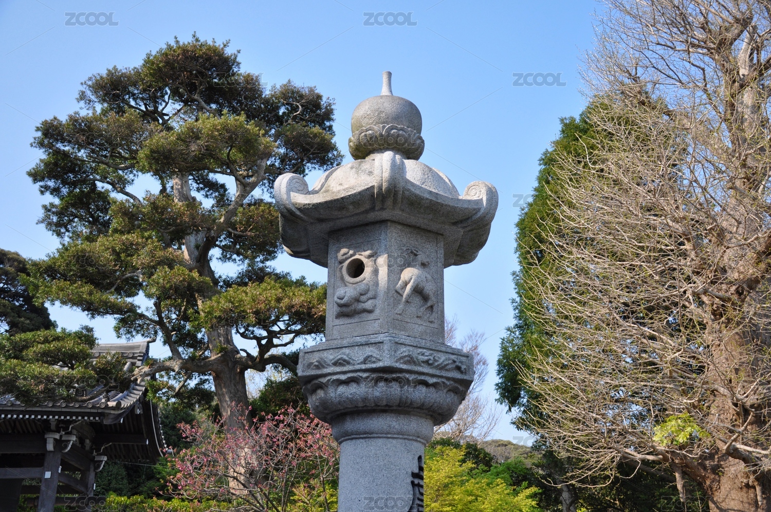 晴天白昼时候,大殿门前竖立着的石灯笼建筑