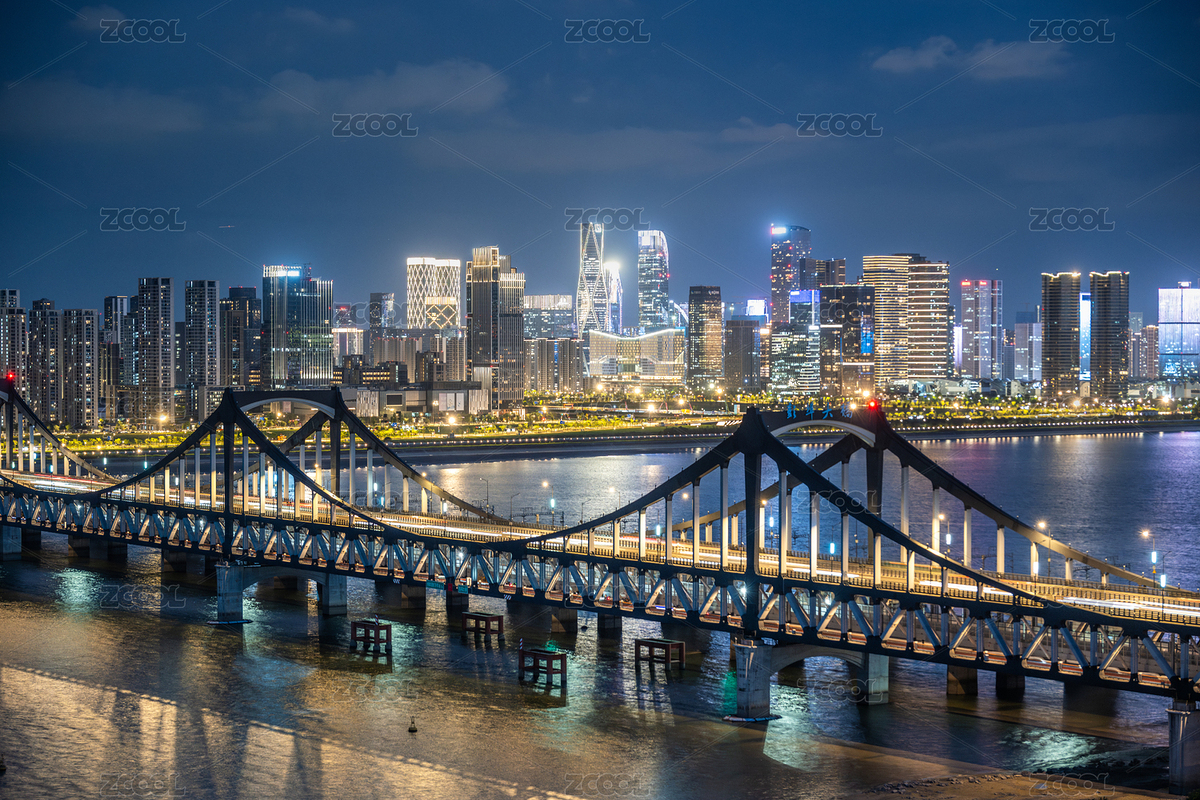 湖北武汉市江滩武汉长江大桥城市天际线夜景