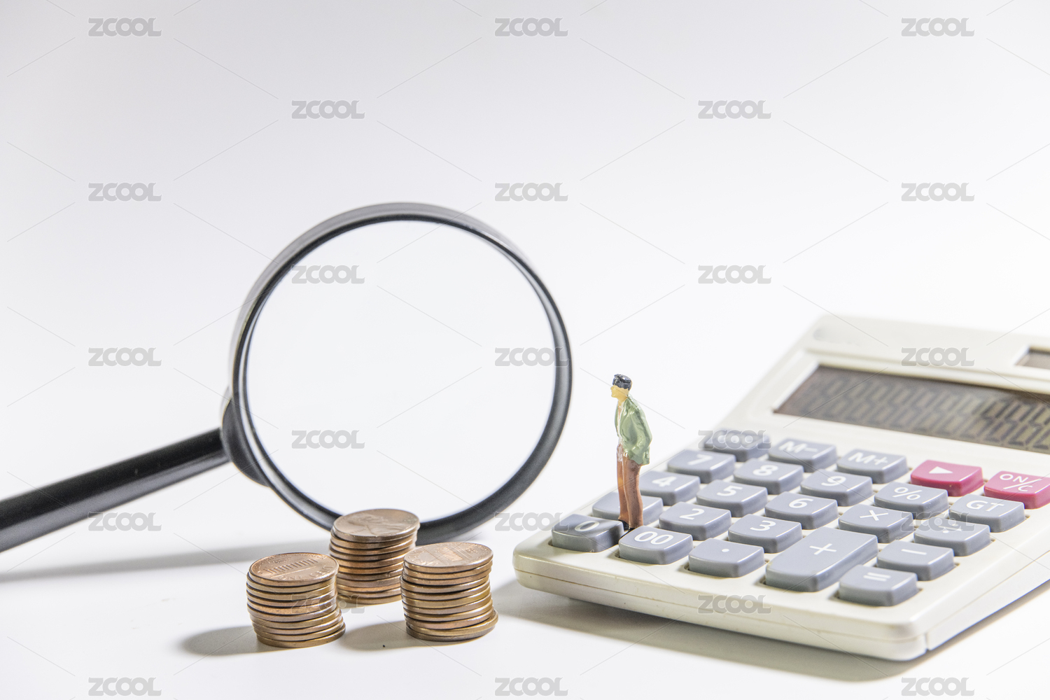 站在计算器上的玩具小人和许多硬币——股票