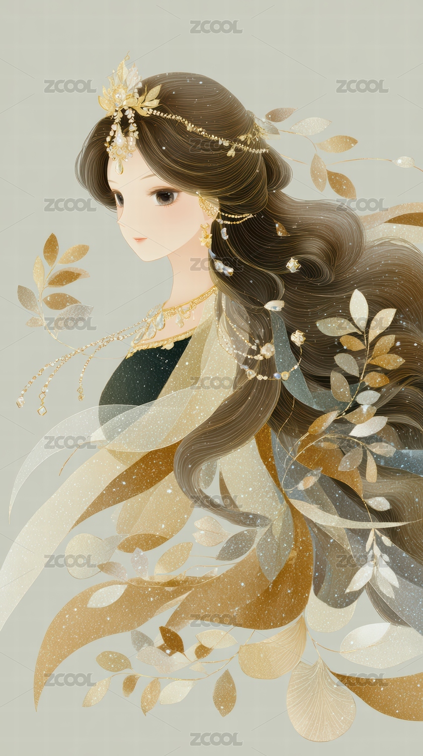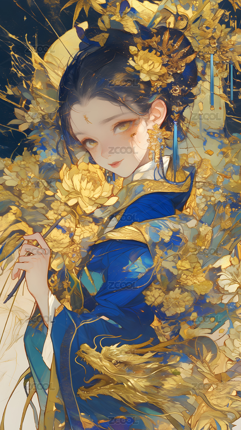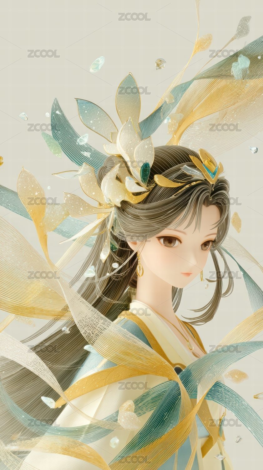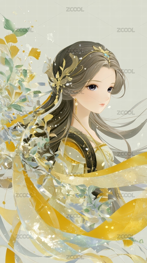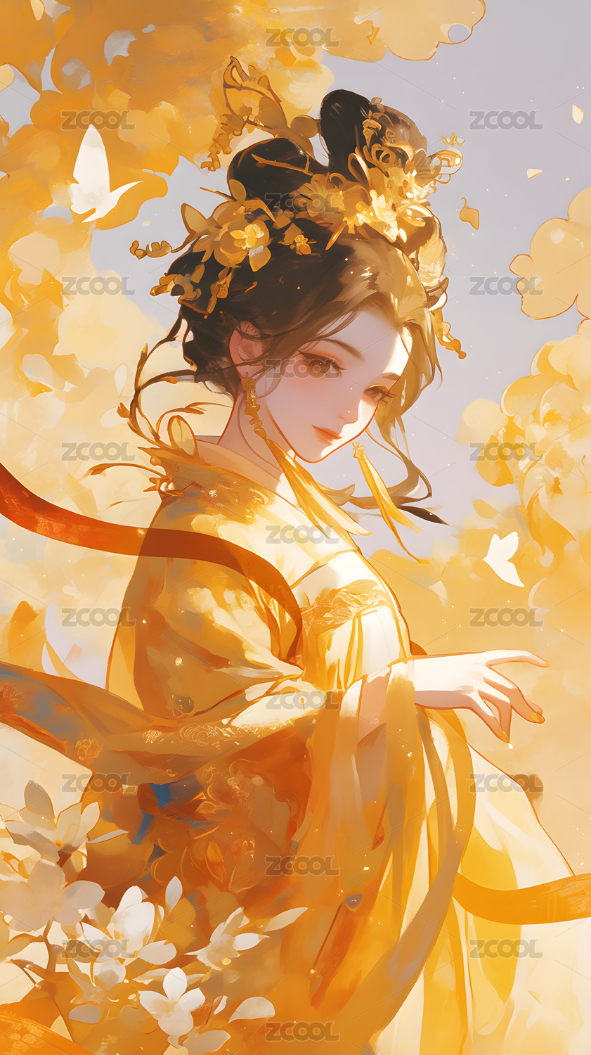 长发,金色,古装,女子,服饰,头饰,花卉,飘带,柔美