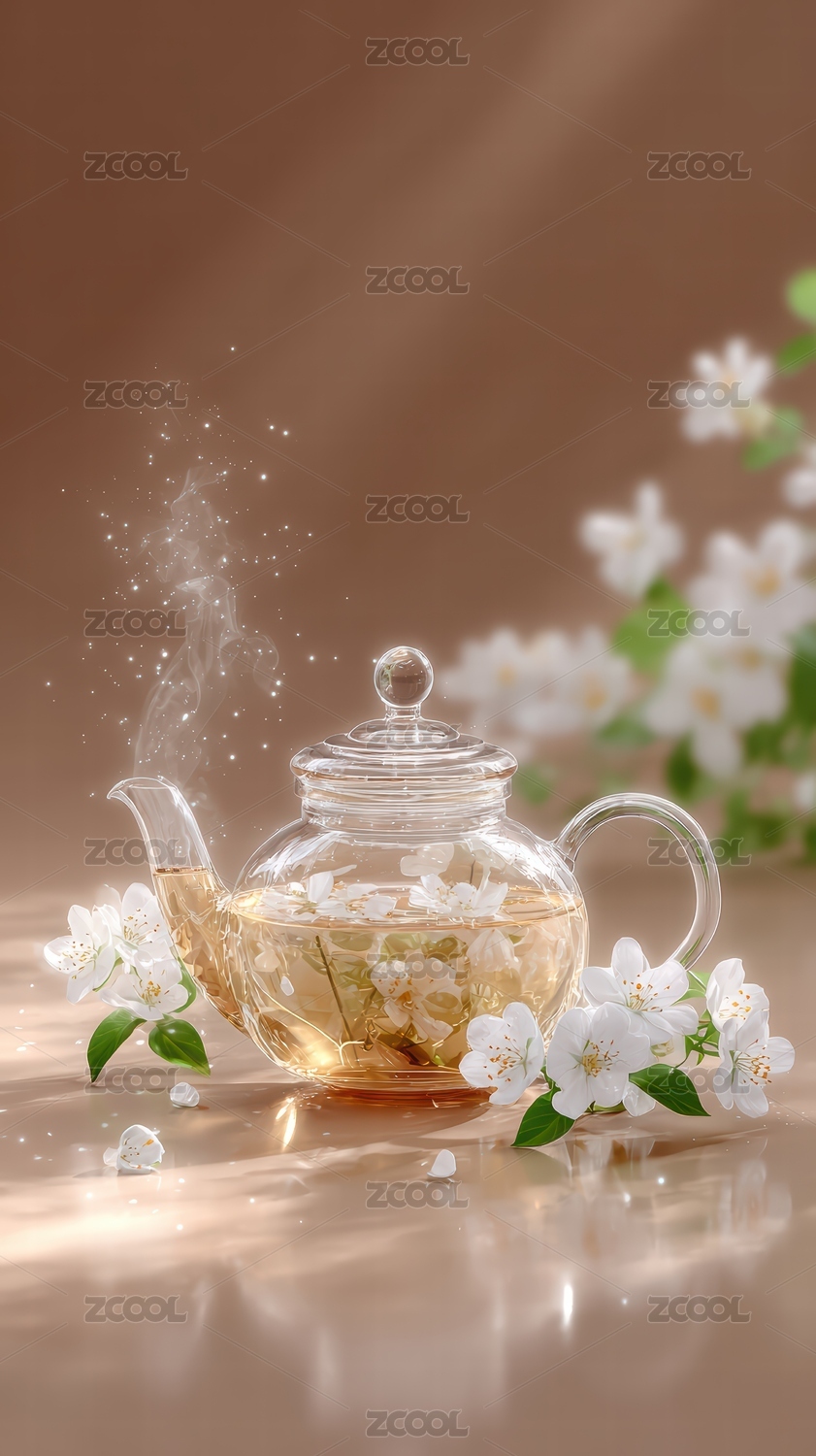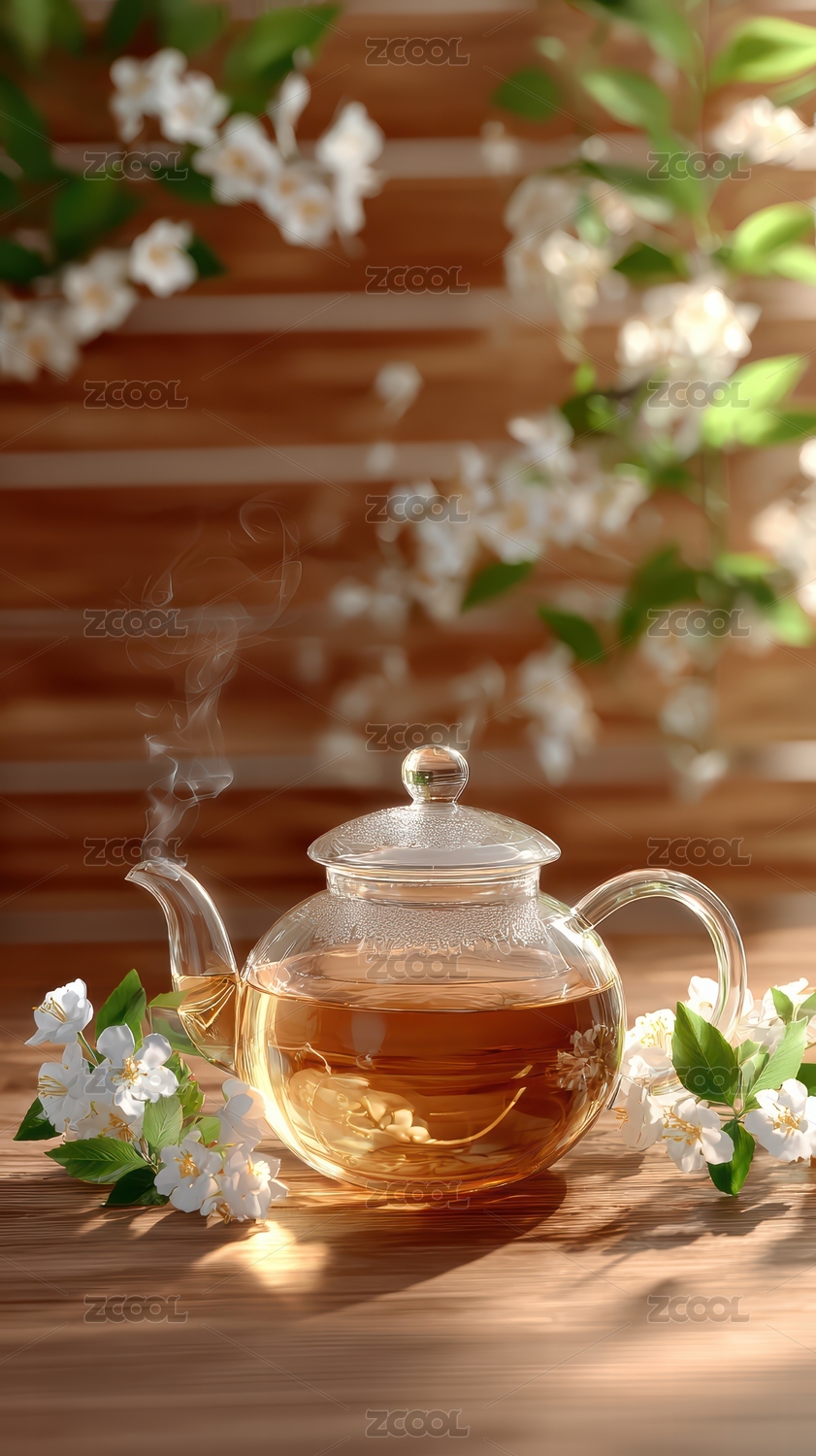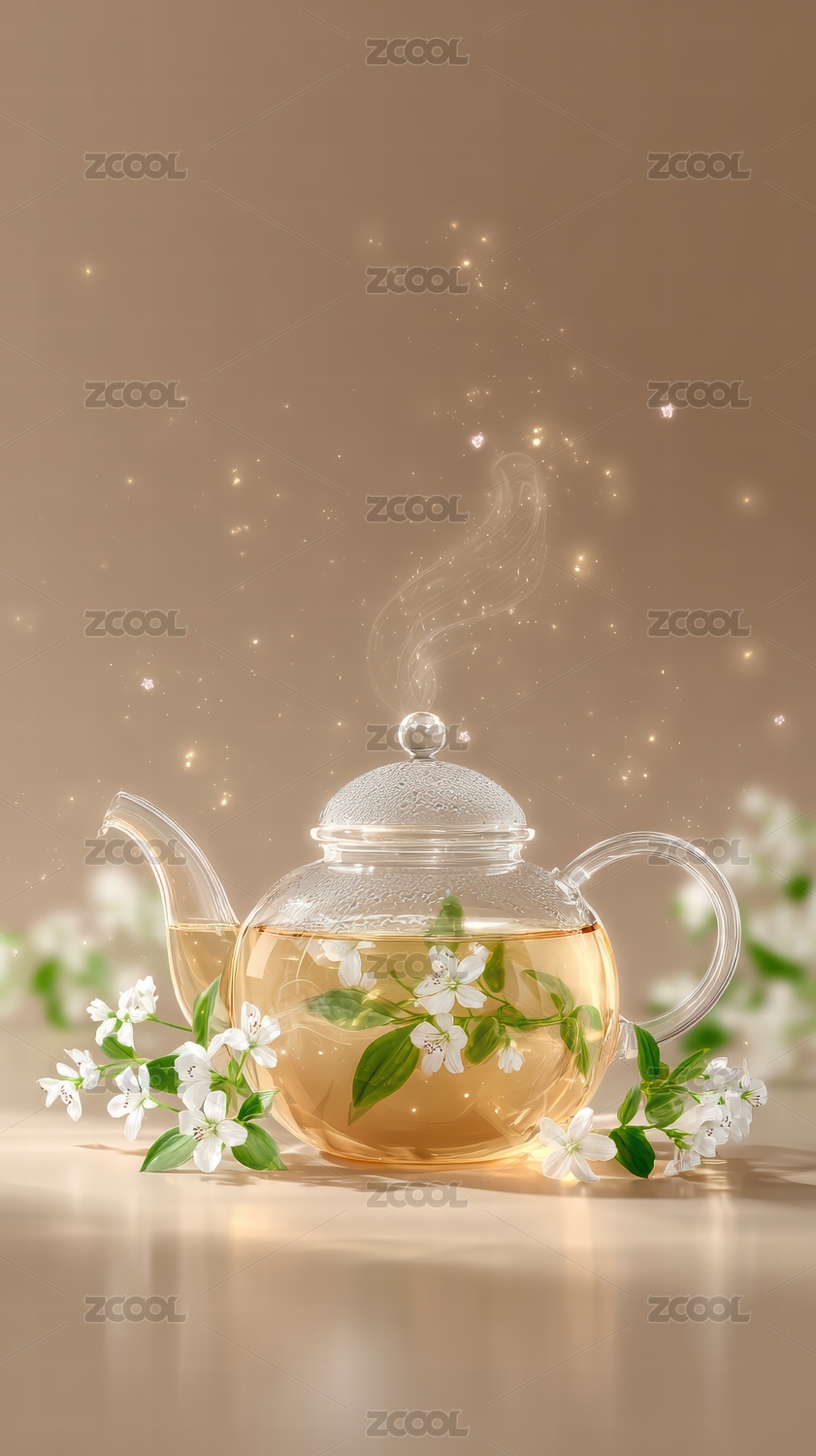 绿叶,光影,花朵,花茶,茶壶,蒸汽,玻璃,茉莉,温暖