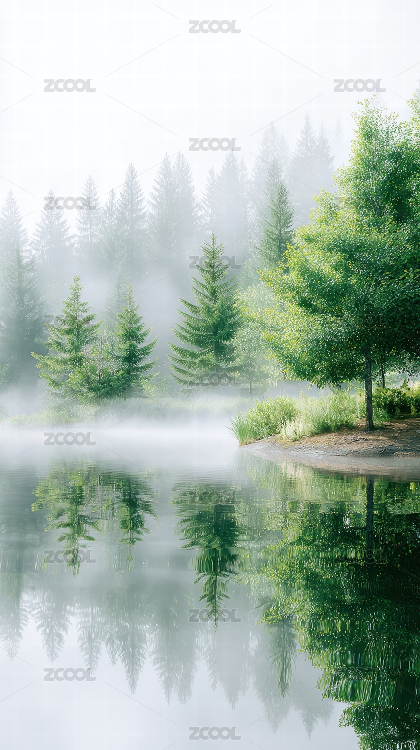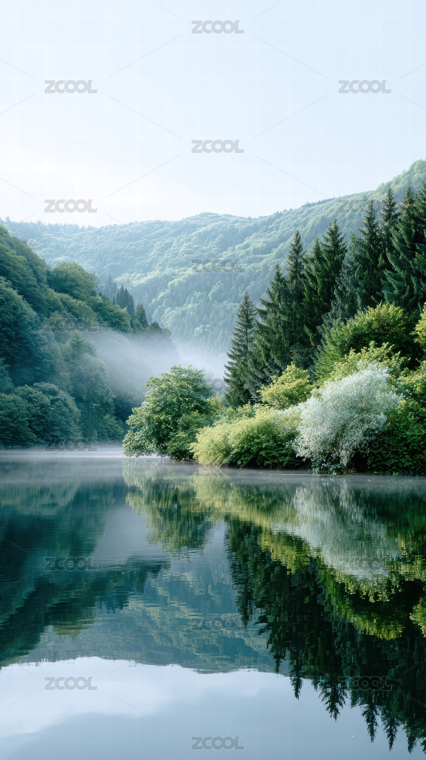 山水间的宁静倒影 雾锁山林的诗意画卷