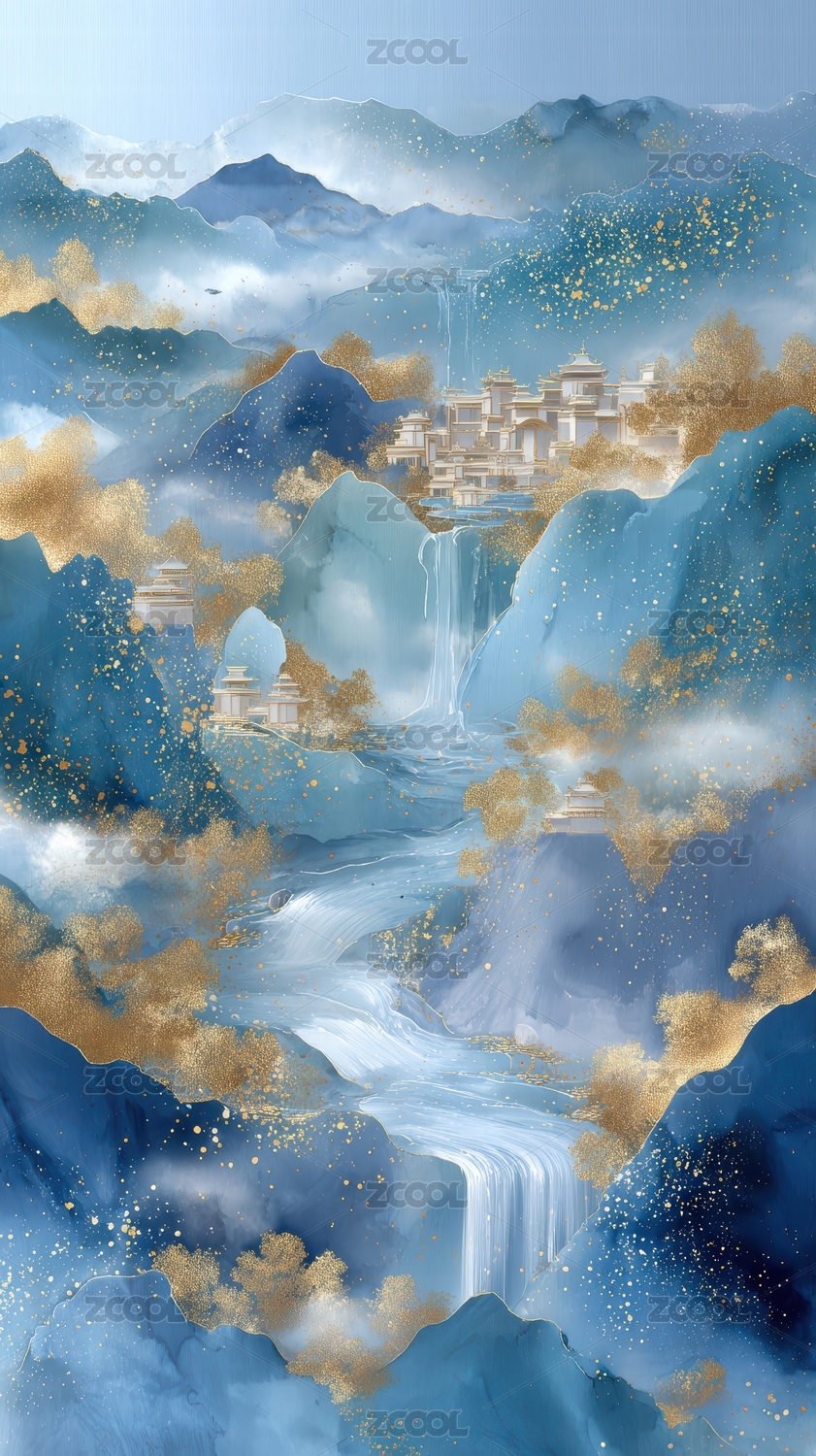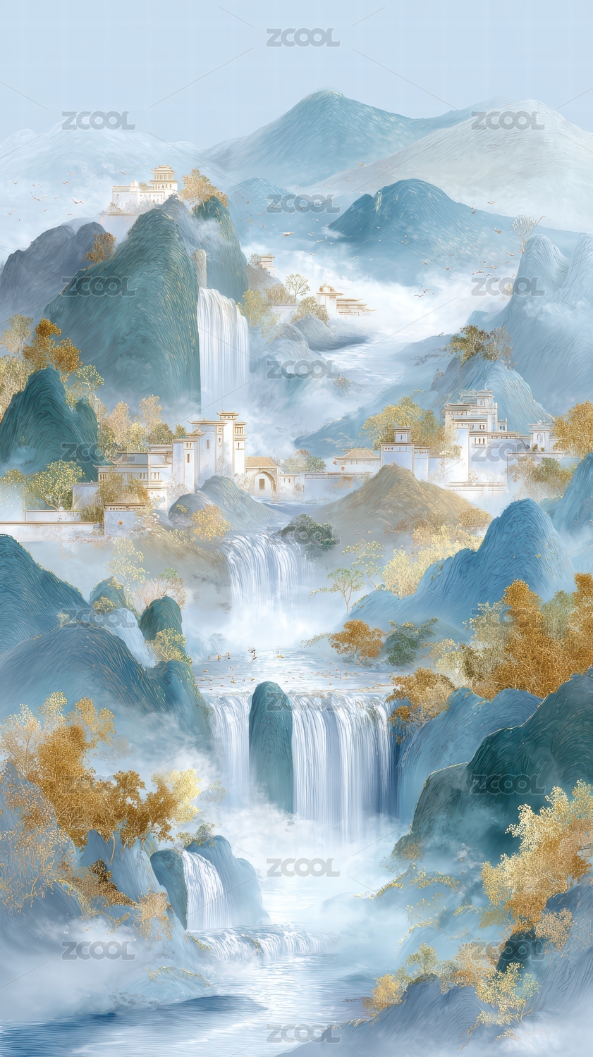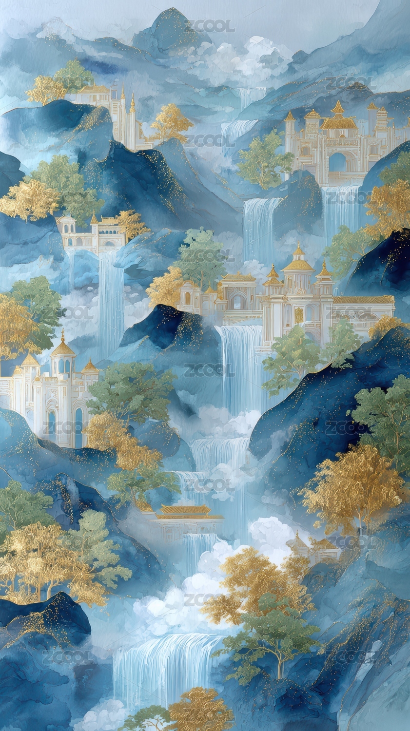 建筑,云雾,梦幻,树木,瀑布,山峰,宫殿,金叶