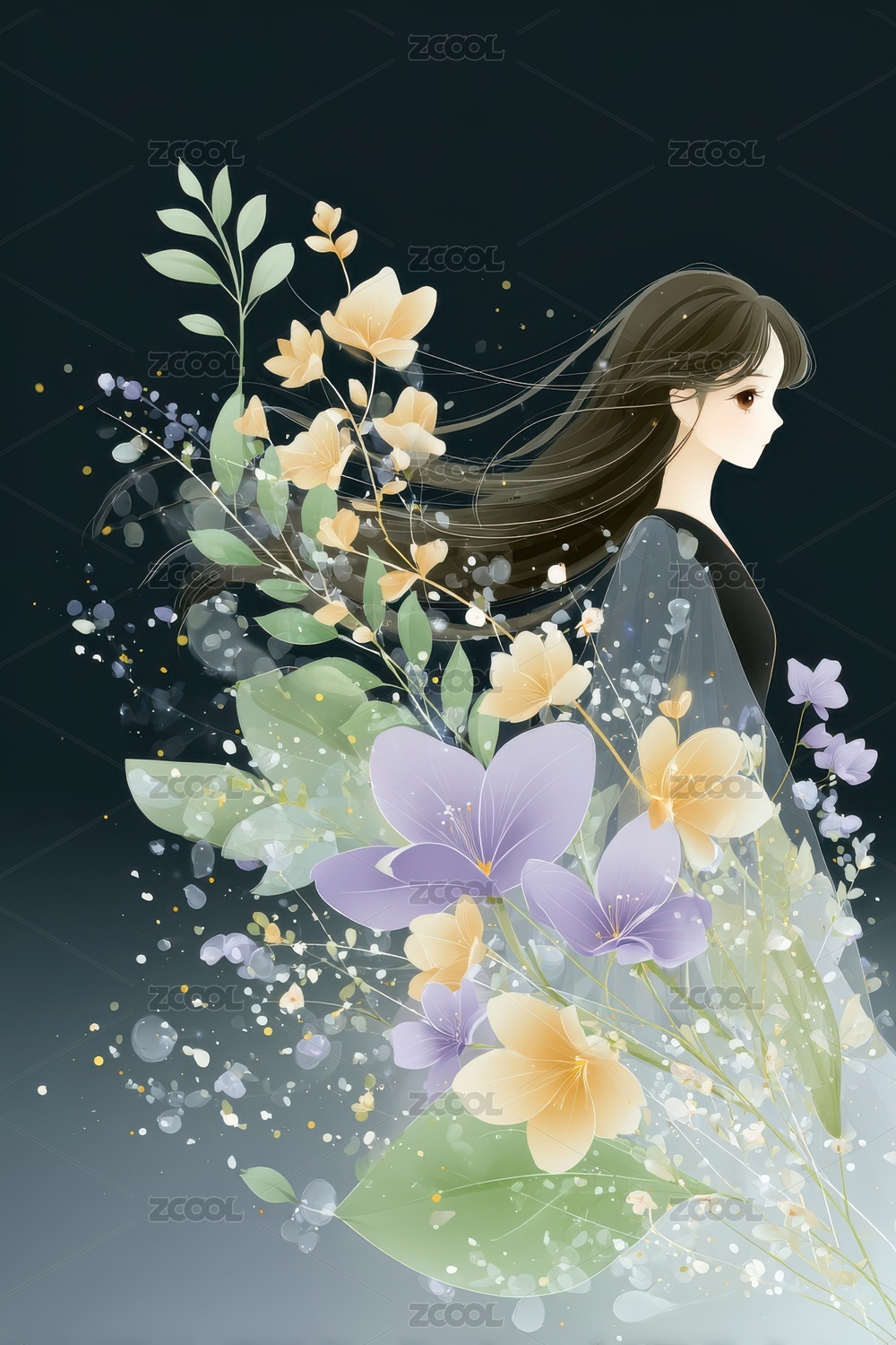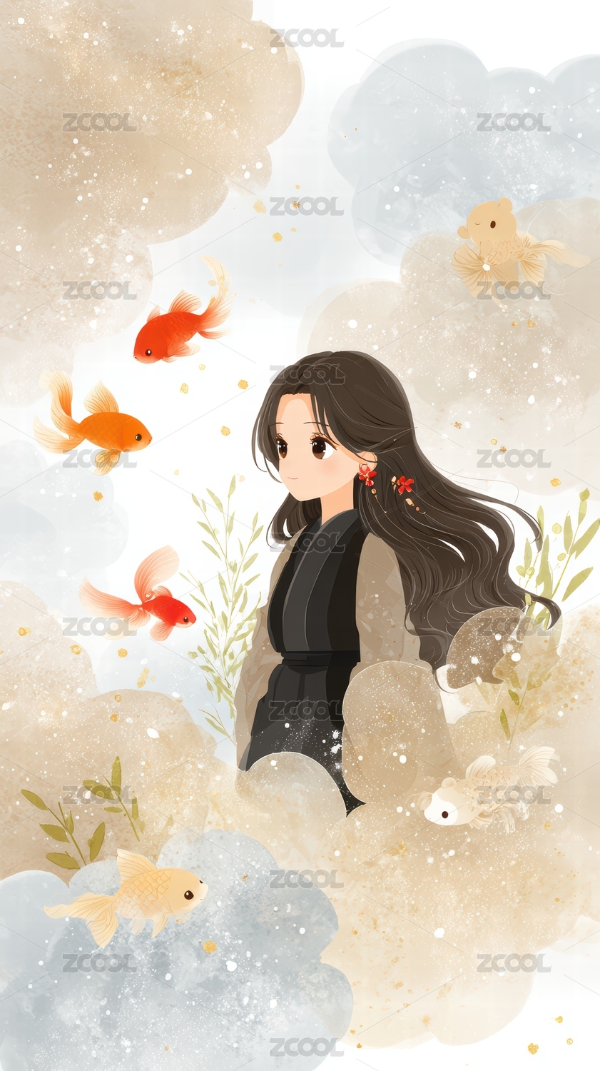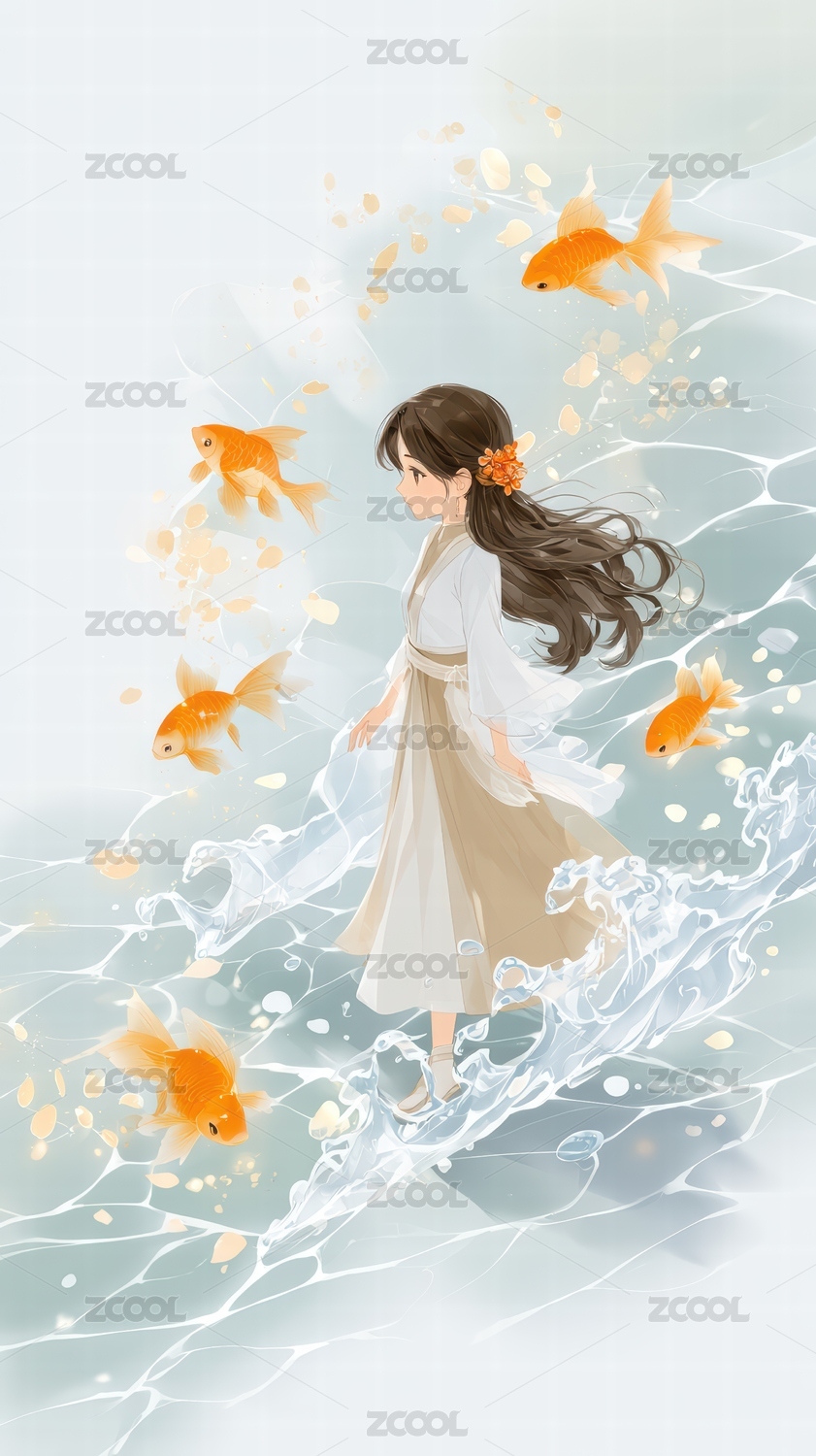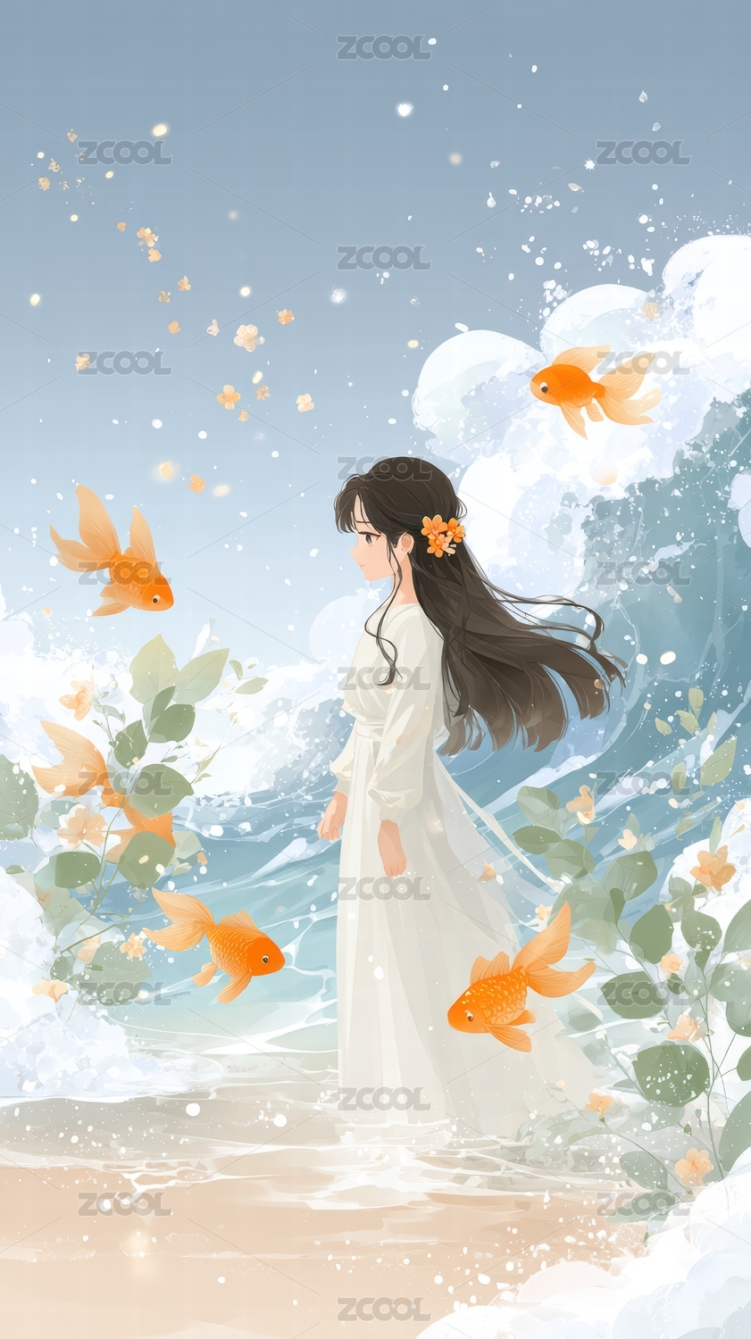 花朵,梦幻,绿叶,长发,少女,鱼儿,黄裙,气泡