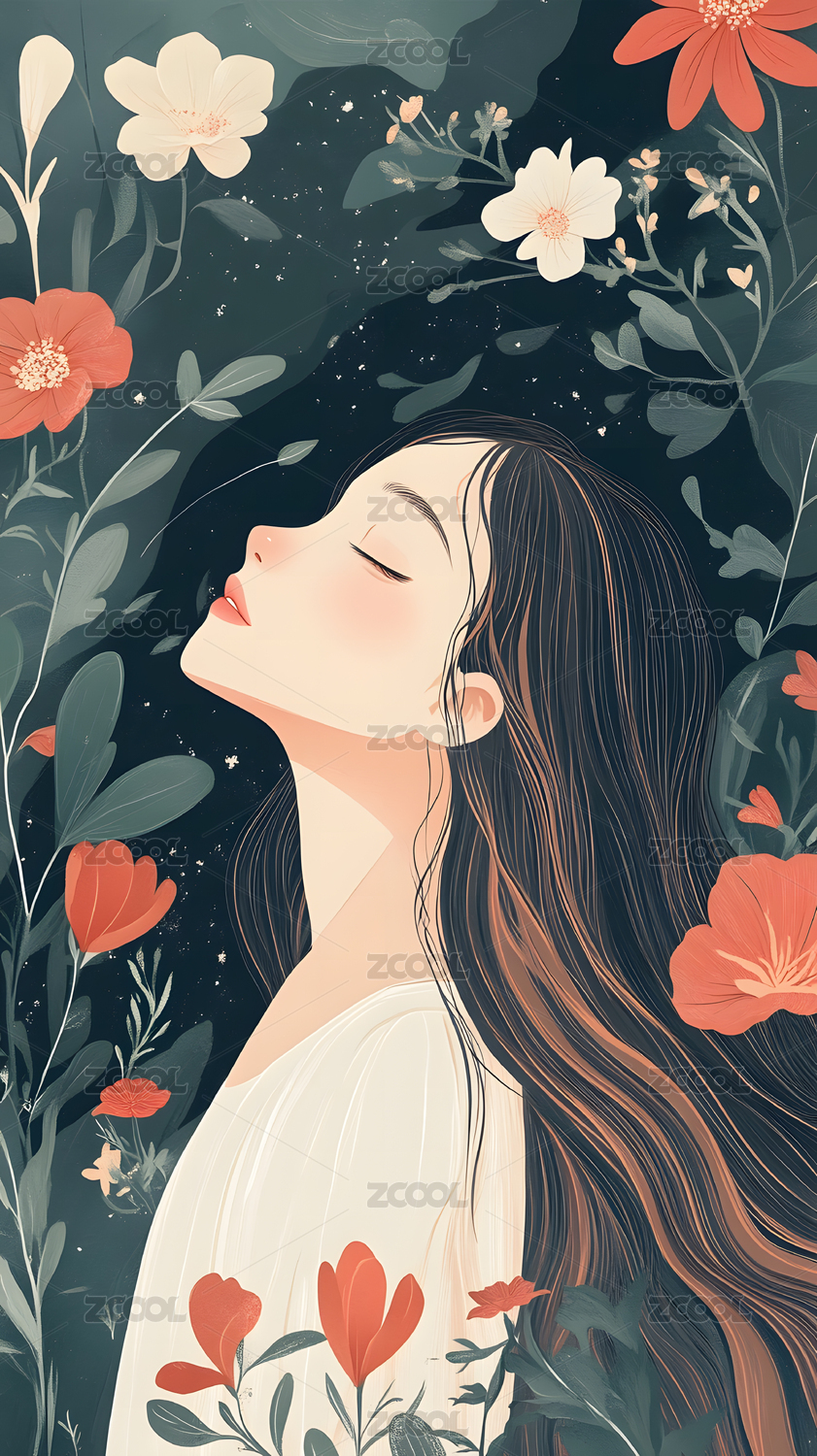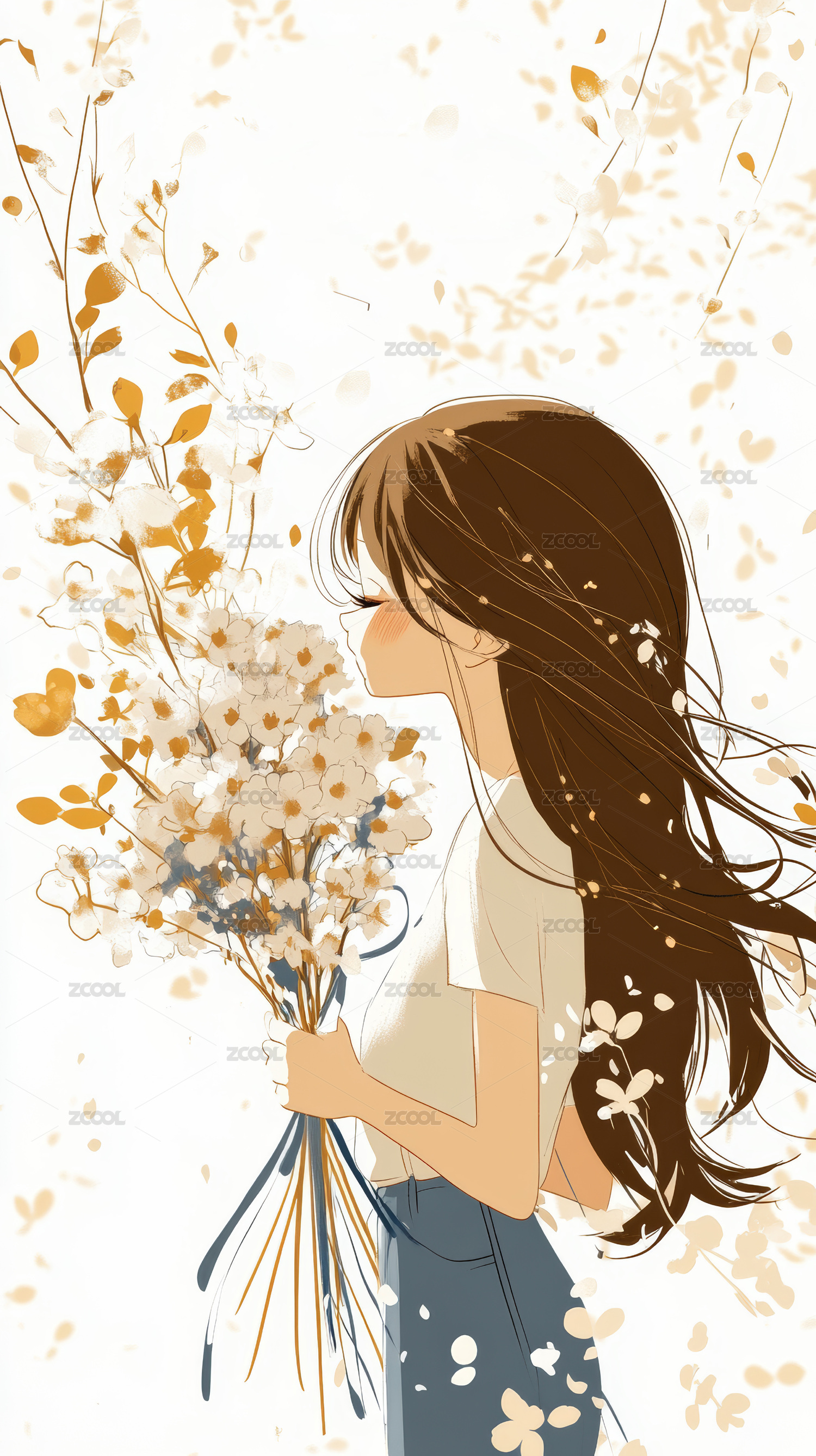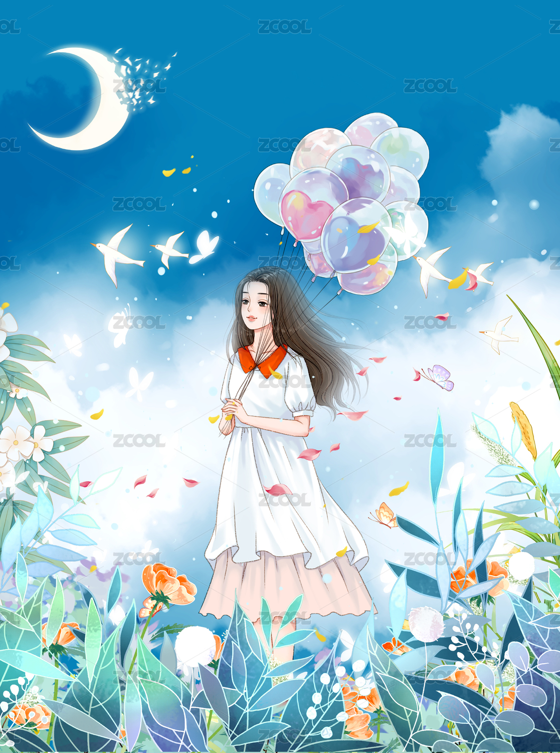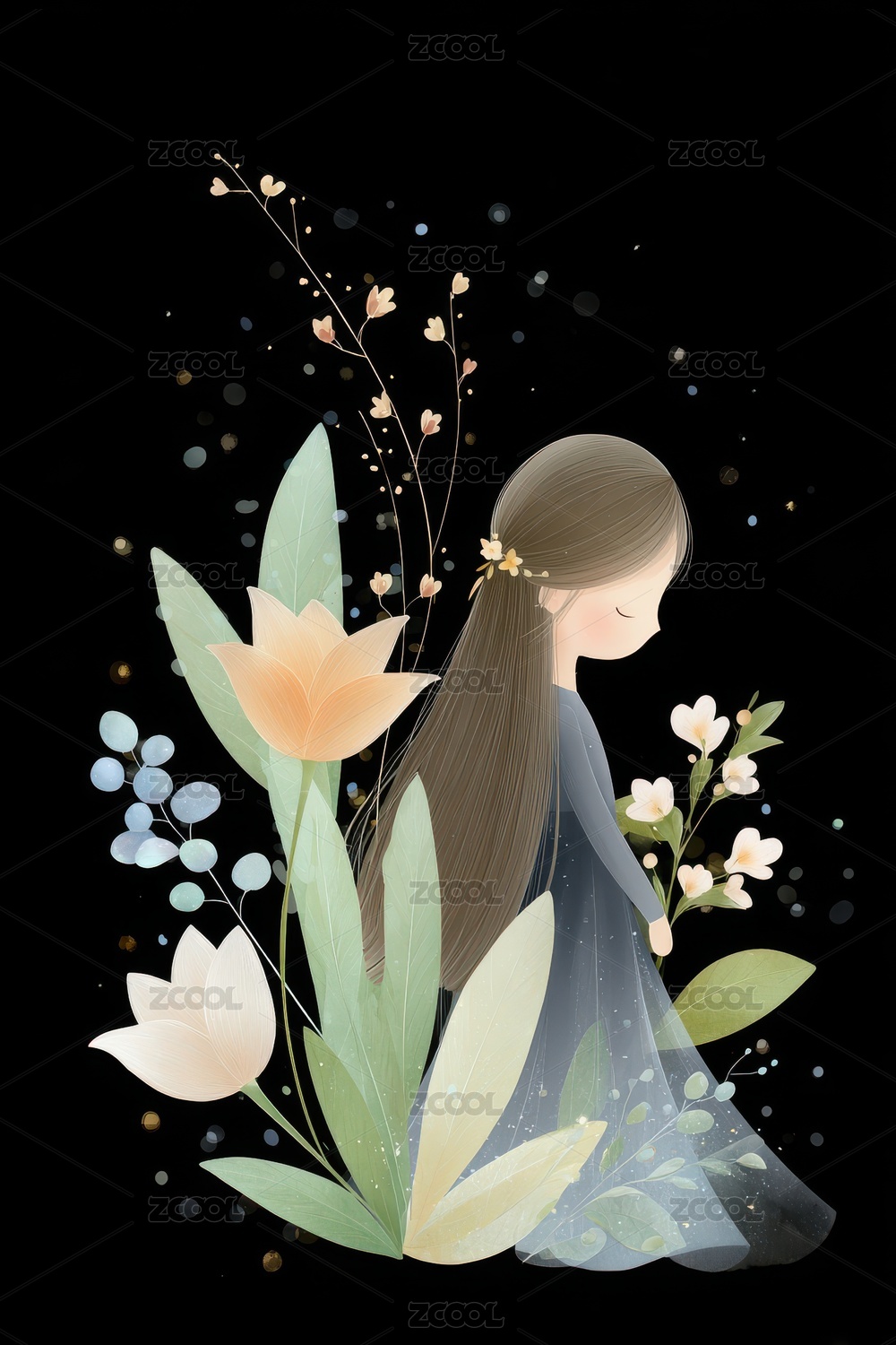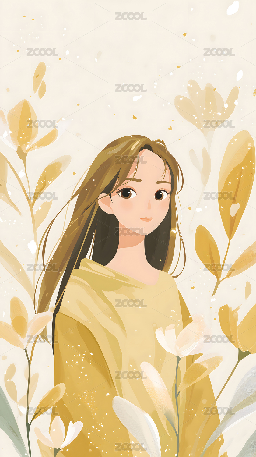 花朵,梦幻,绿叶,长发,少女,鱼儿,黄裙,气泡