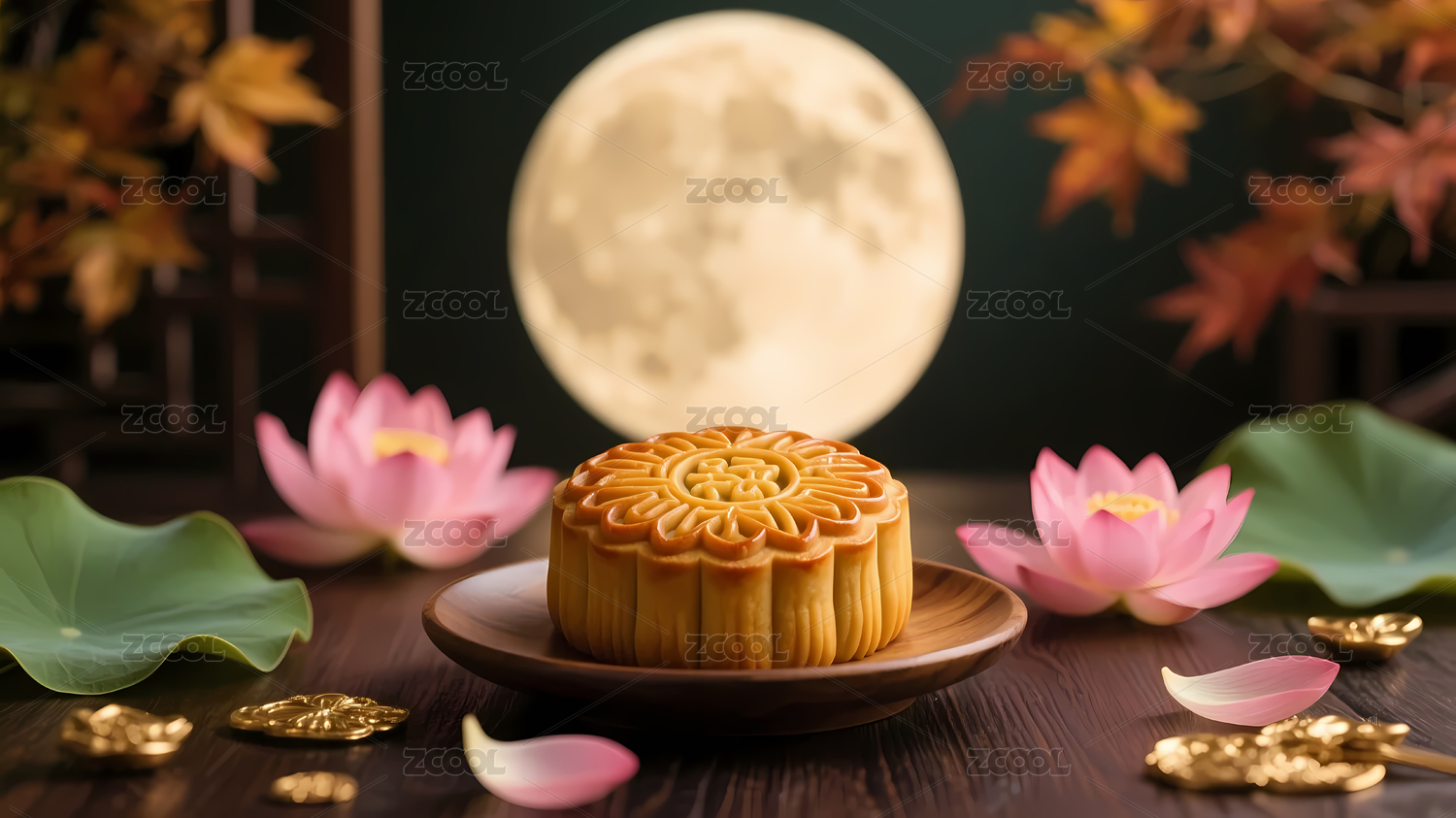 背景,满月,祥和,月饼,金黄色,花纹,夜空,菊花,温馨,灯笼