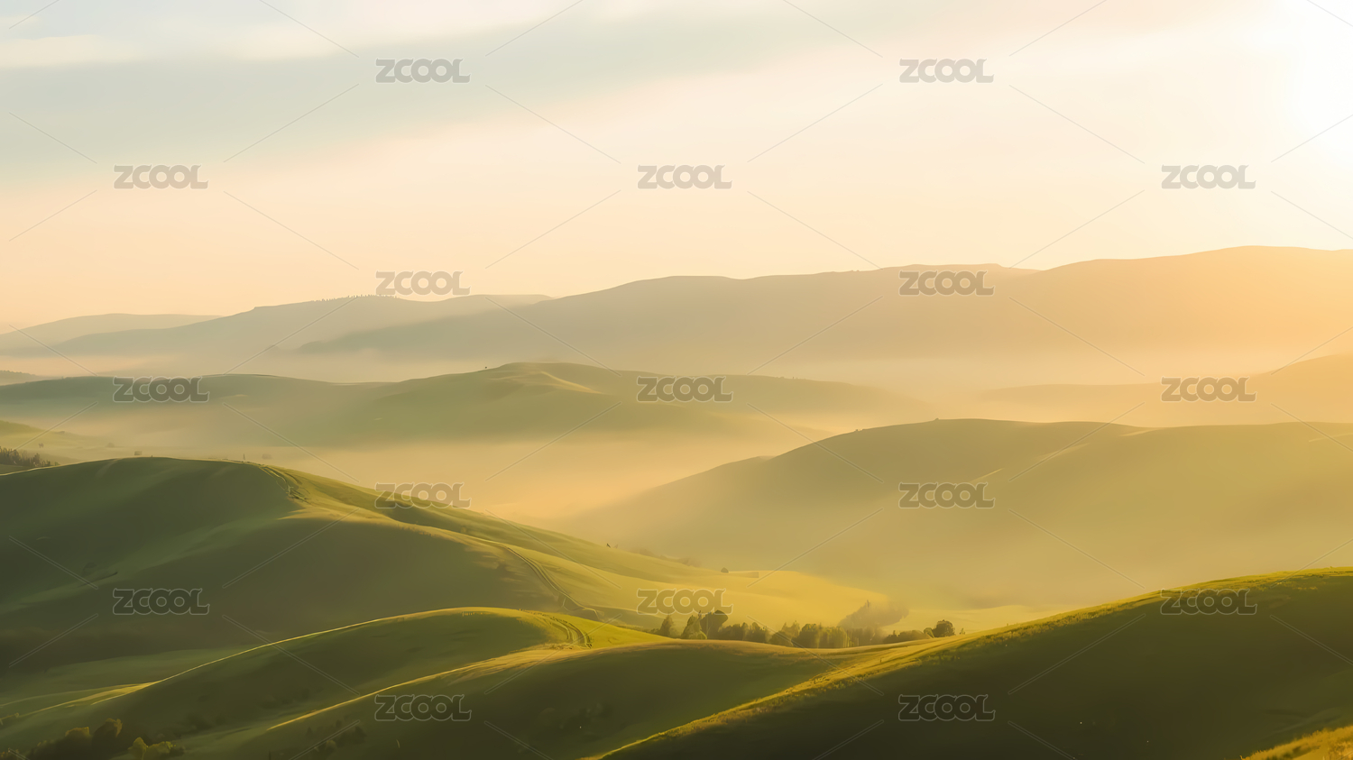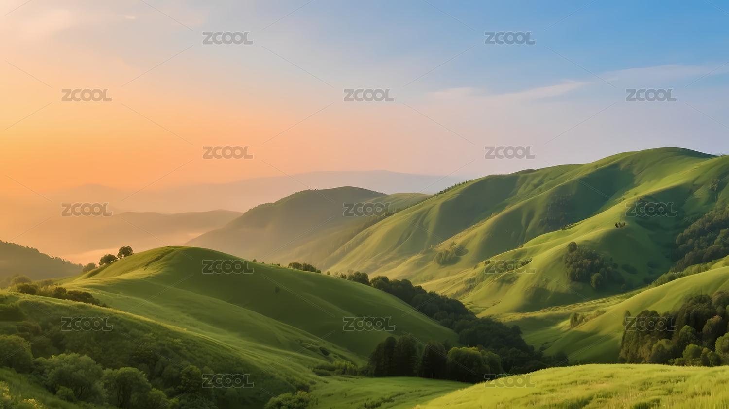 绿色,渐变,背景,天空,柔和,宁静,夕阳,山丘,起伏,远山