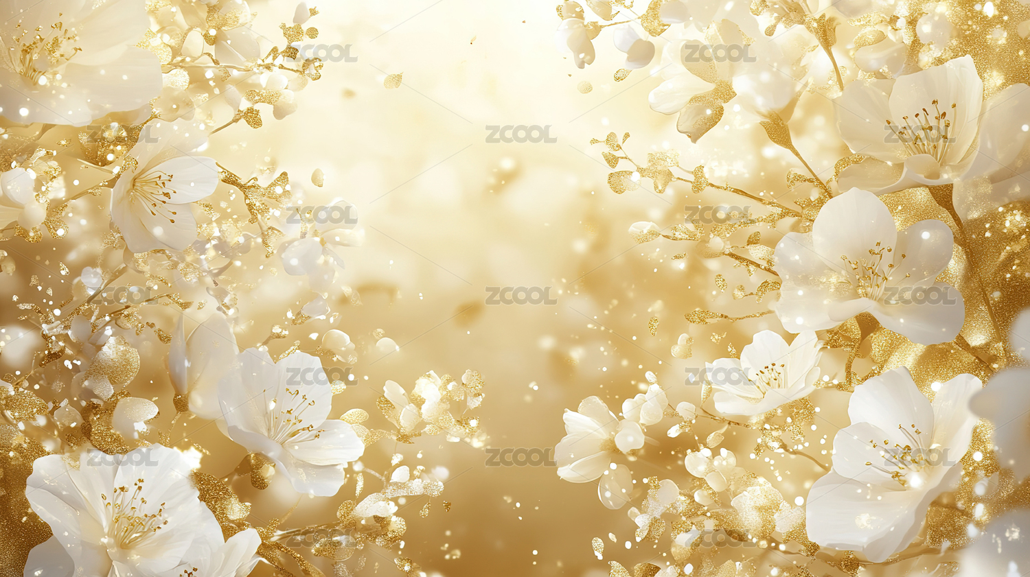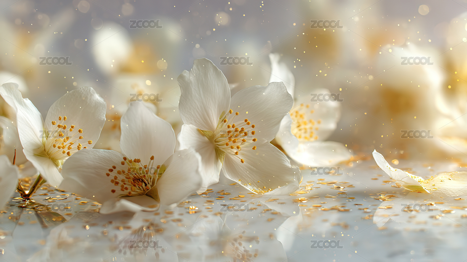 绽放的白色花朵与金色光斑