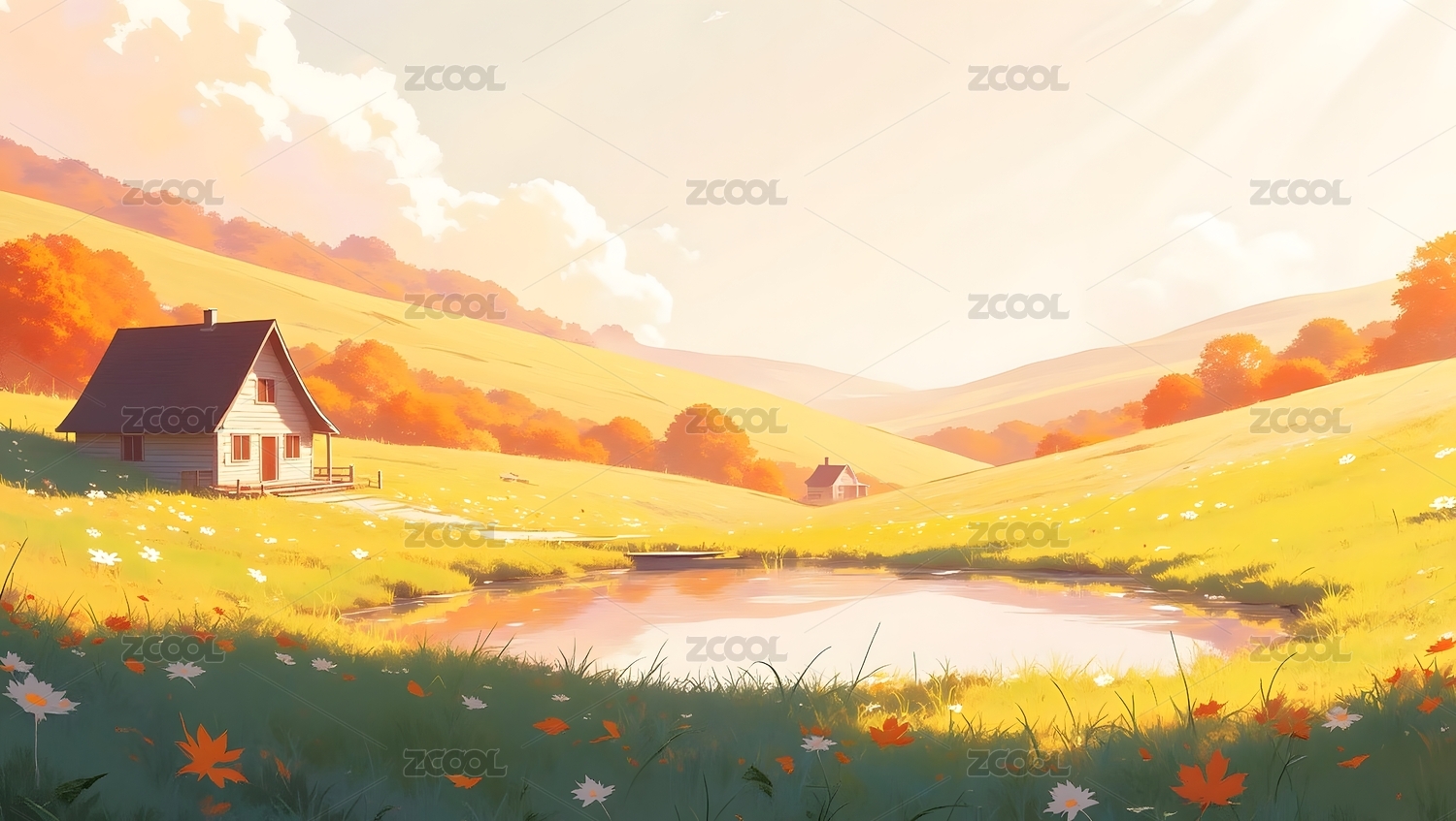 阳光草地与小屋