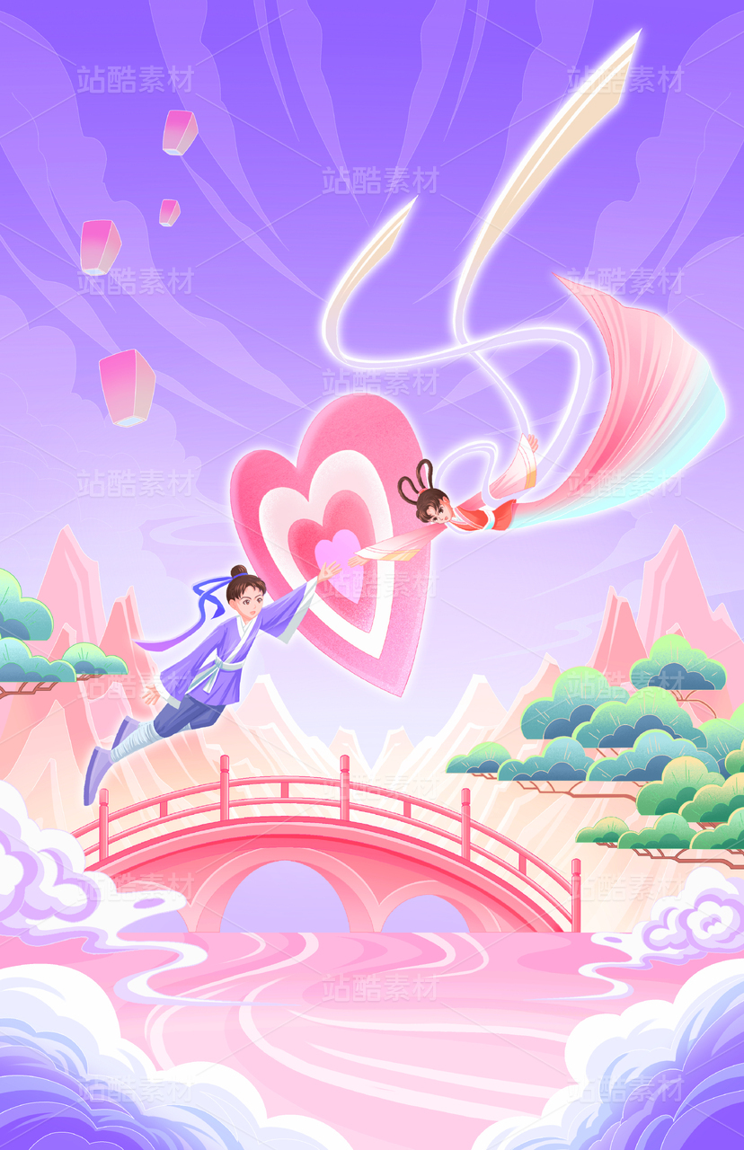 【分层可编辑】浪漫七夕竖版海报古风牛郎织女氛围插画