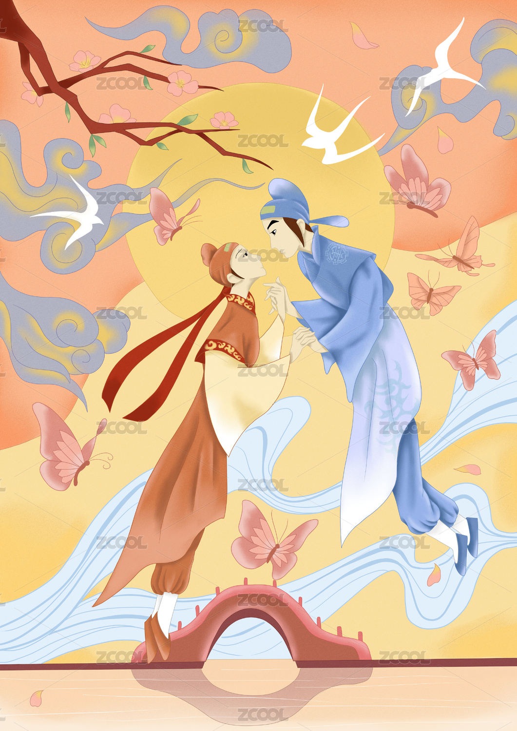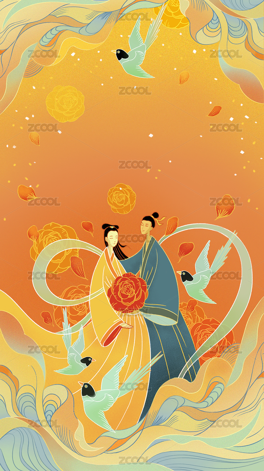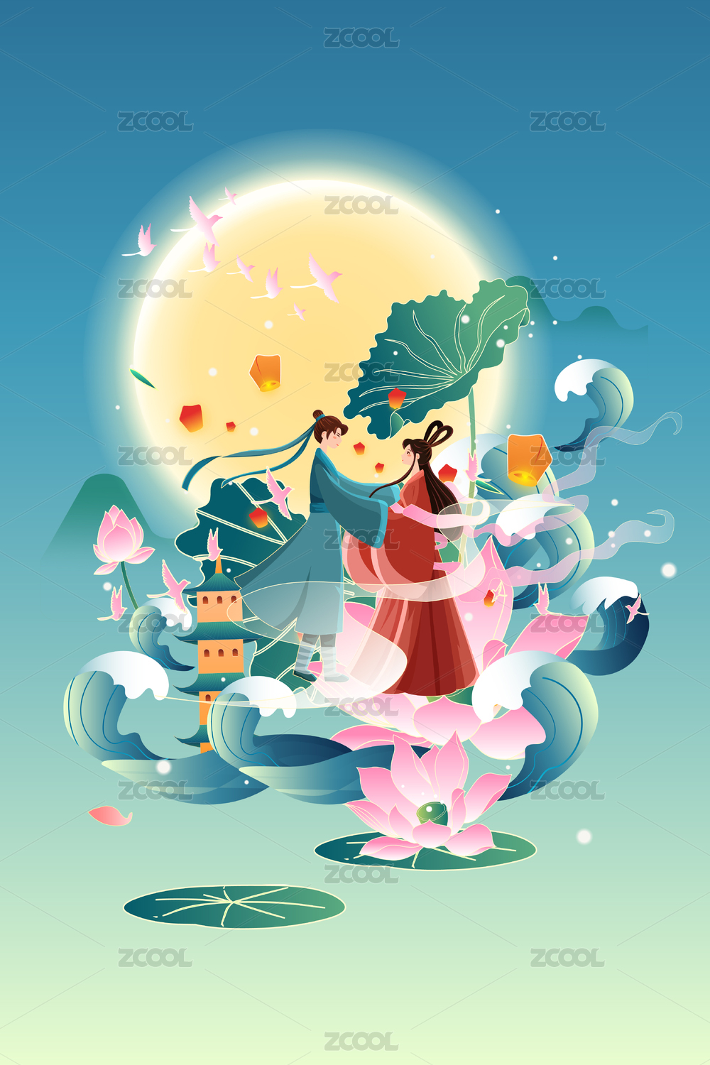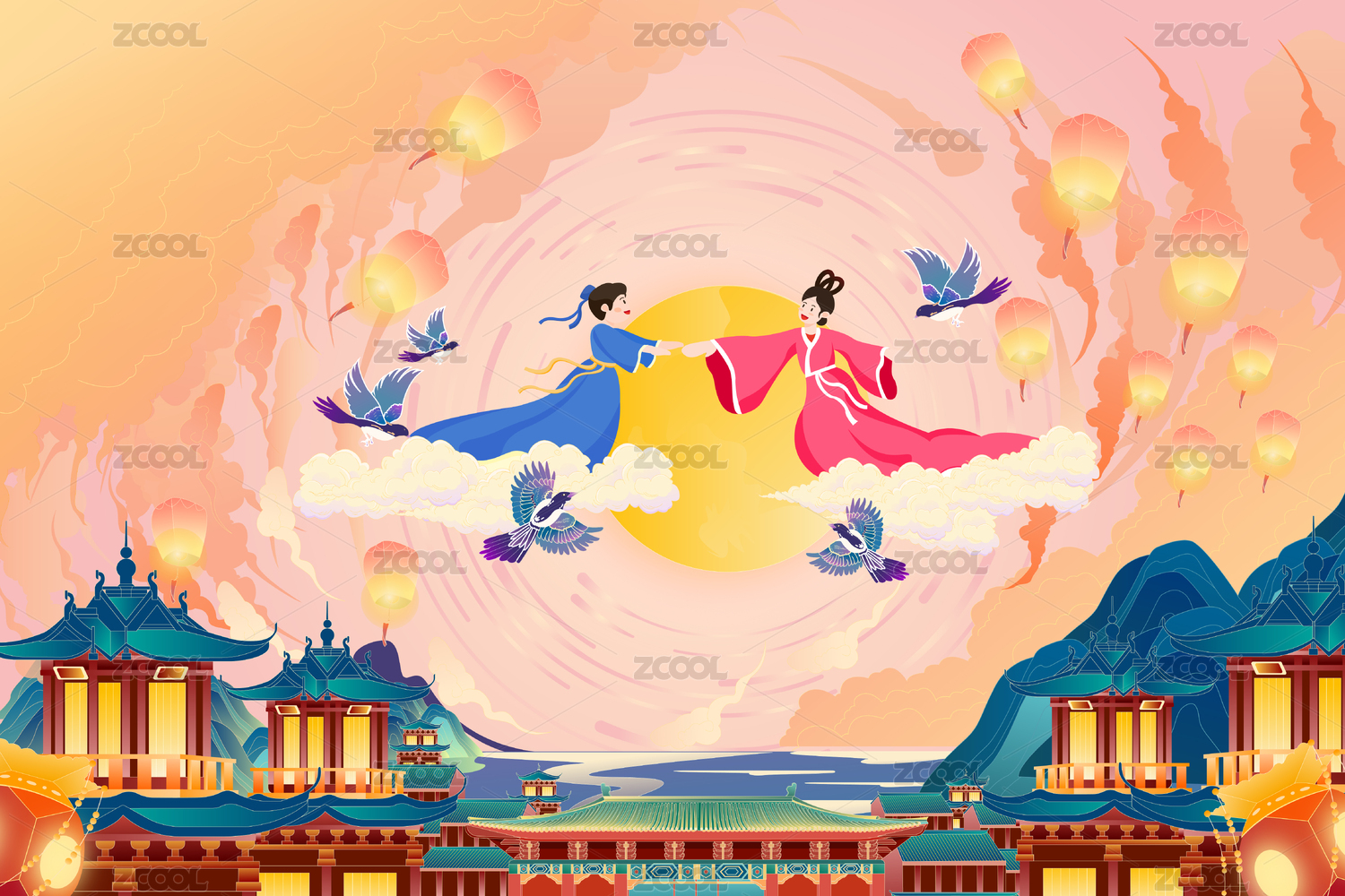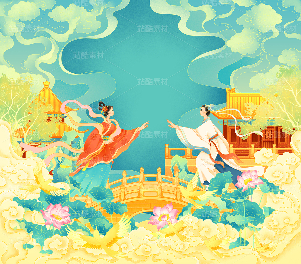 七夕节,牛郎,织女,鹊桥相会,祥云,爱情传说,荷花荷叶,古建筑,国潮,情侣,神仙,男女