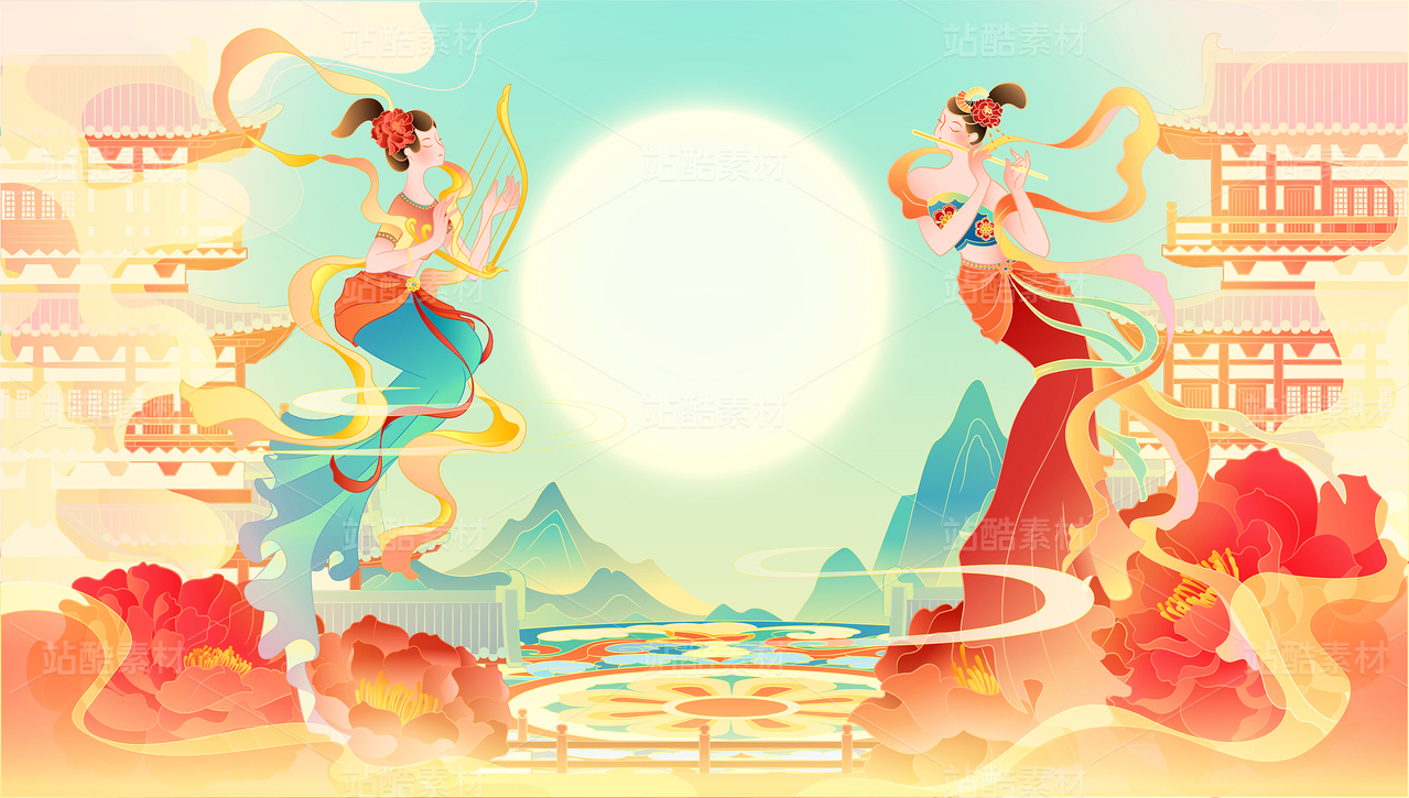 唐朝敦煌宫殿祥云牡丹奏乐舞蹈飞天伎乐藻井花纹插画