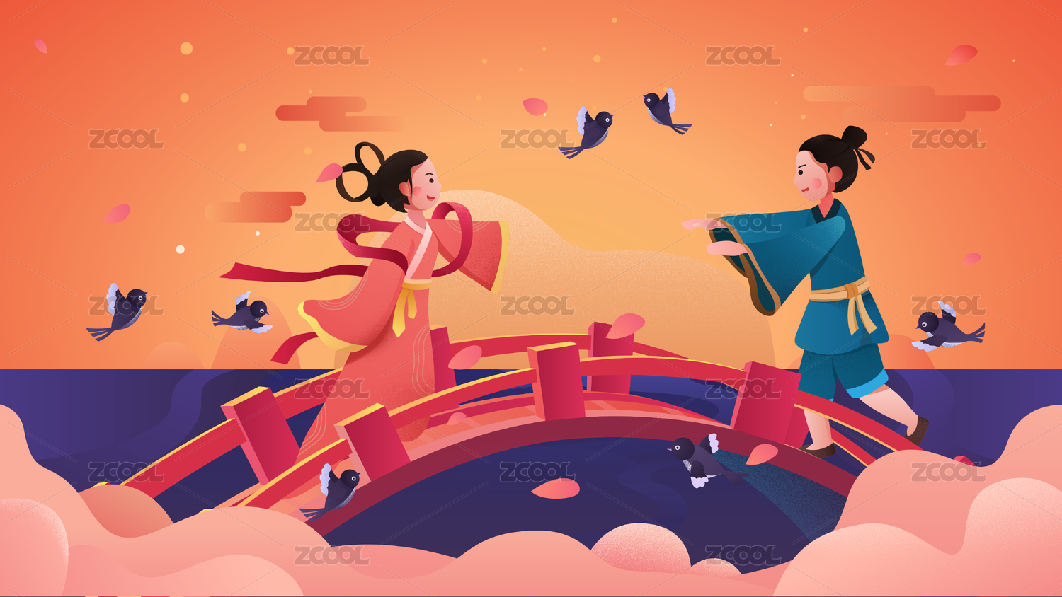 七夕节牛郎织女乞巧节鹊桥相会传统节日插画