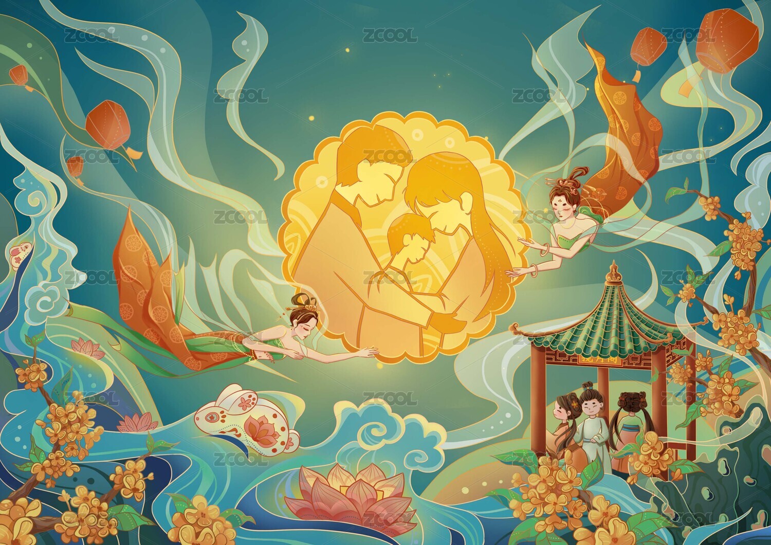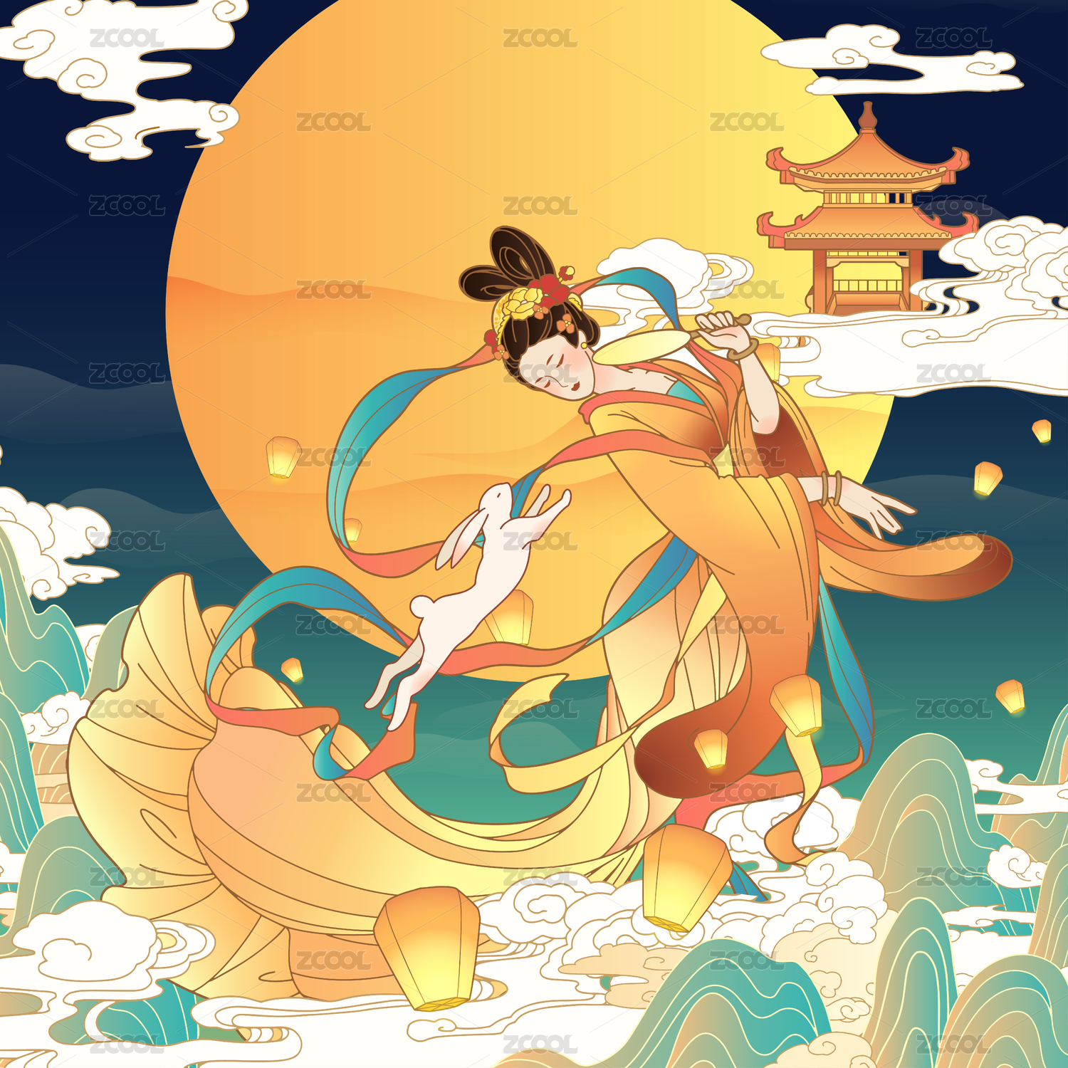 中秋节日嫦娥奔月月兔祥云国潮矢量方