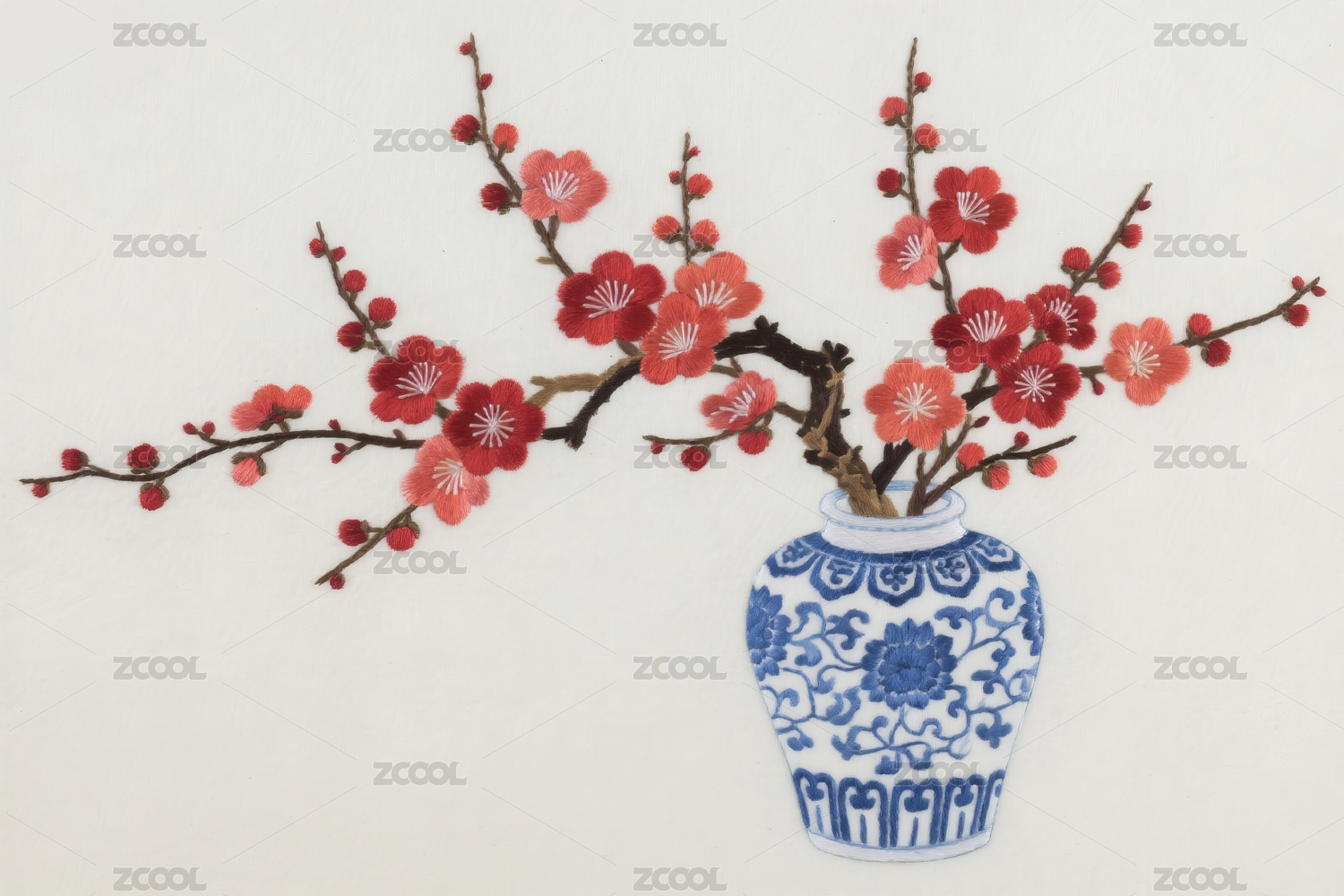 红梅,梅花,刺绣,苏绣,花,植物,花瓶,青花瓷,瓷器,古风