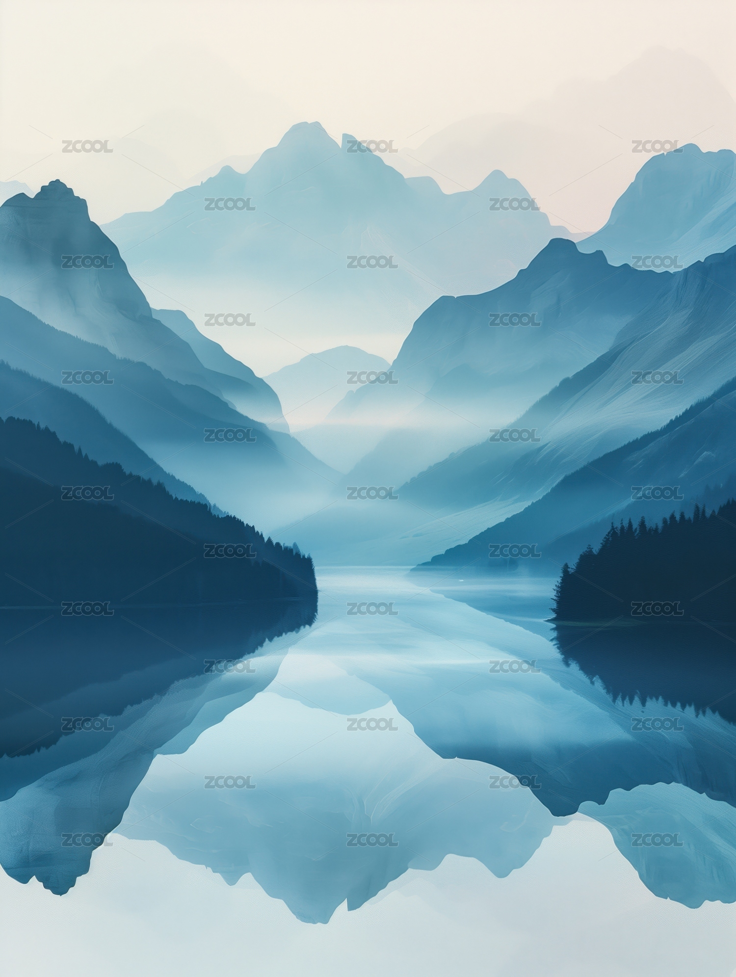 蓝色,天空,静谧,自然,山峦,云雾,朦胧,山水,湖泊,倒影