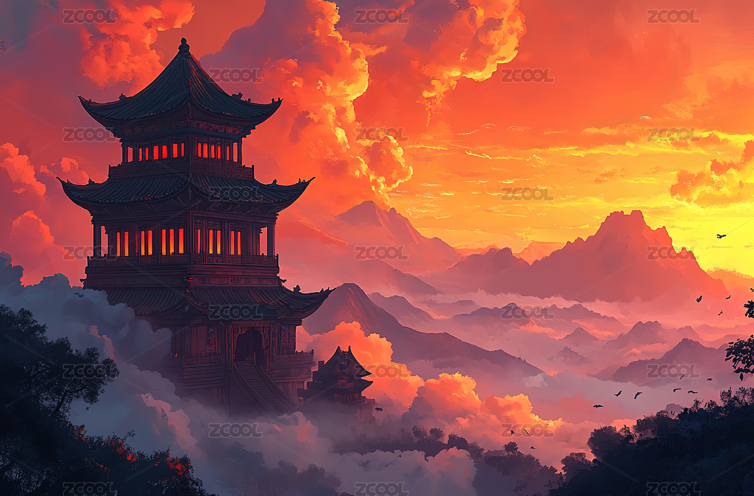 建筑,自然,景色,美丽,风景,金色,山谷,艺术,插图,亚洲
