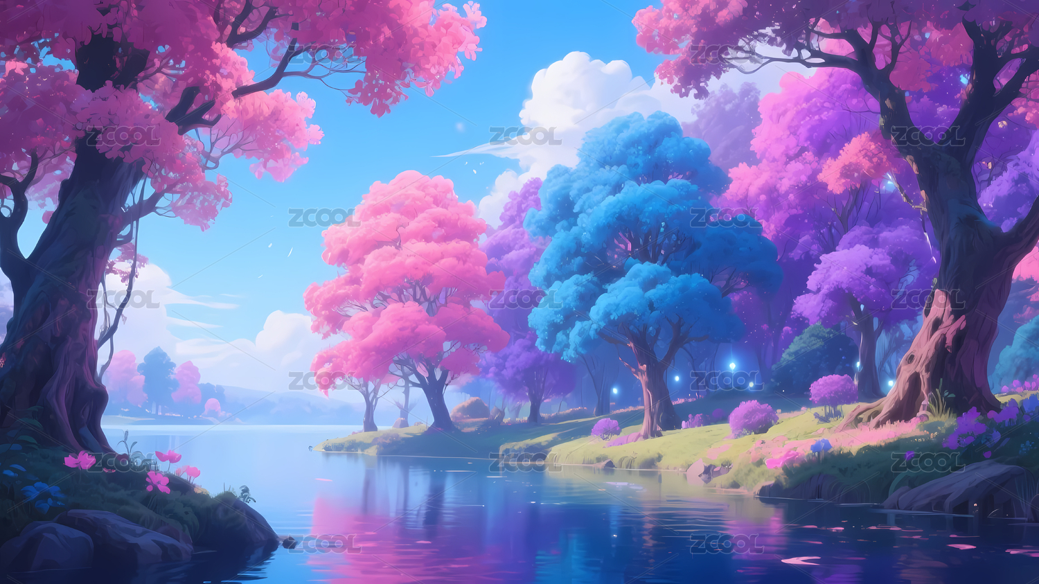 梦幻彩色树木湖面