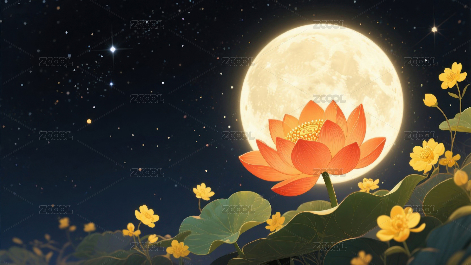 夜空,满月,黄色,蓝色,绿色,植物,水面,粉色,荷叶,睡莲