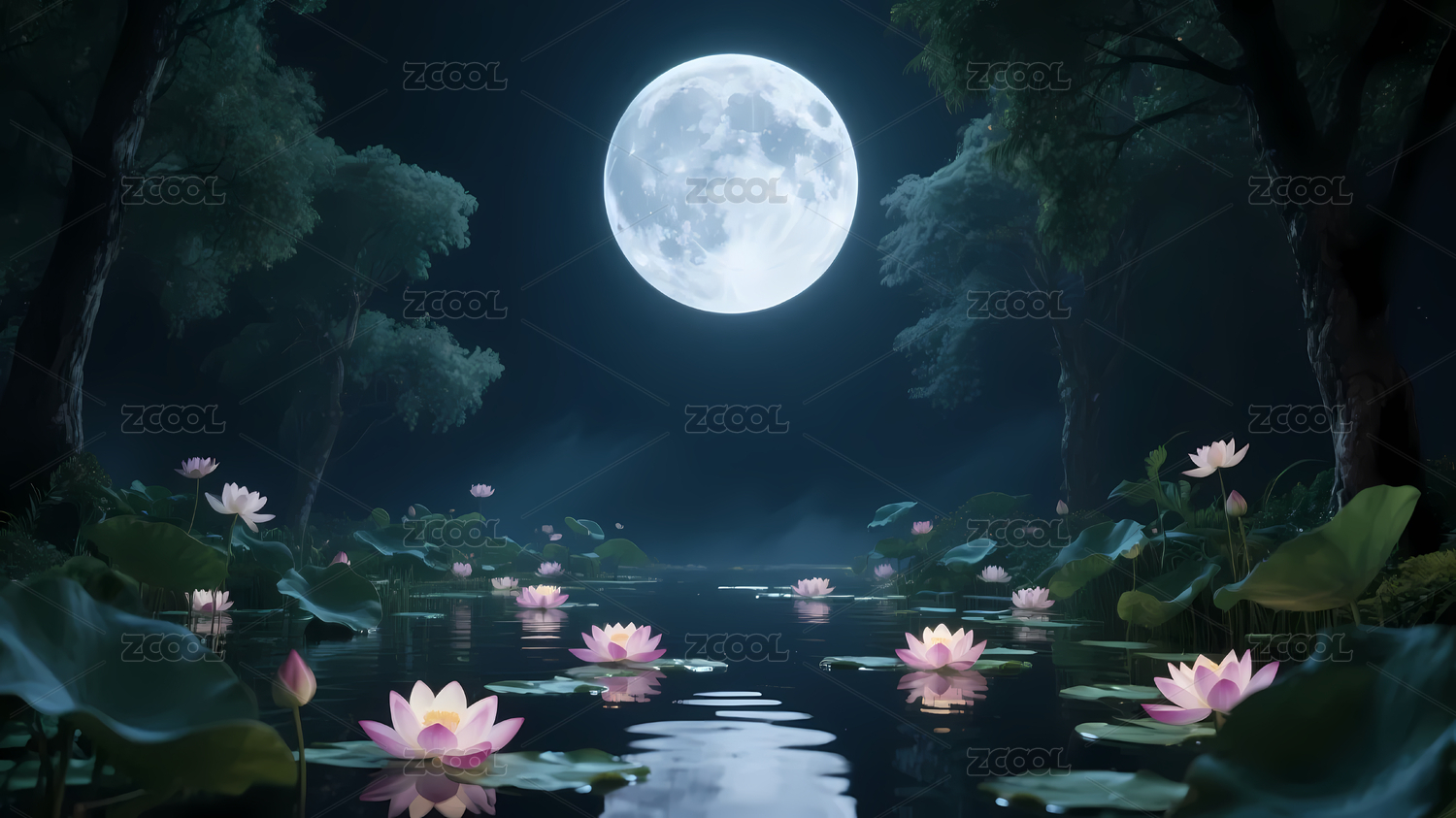 夜空,满月,黄色,蓝色,宁静,绿色,白色,水面,莲花,草丛