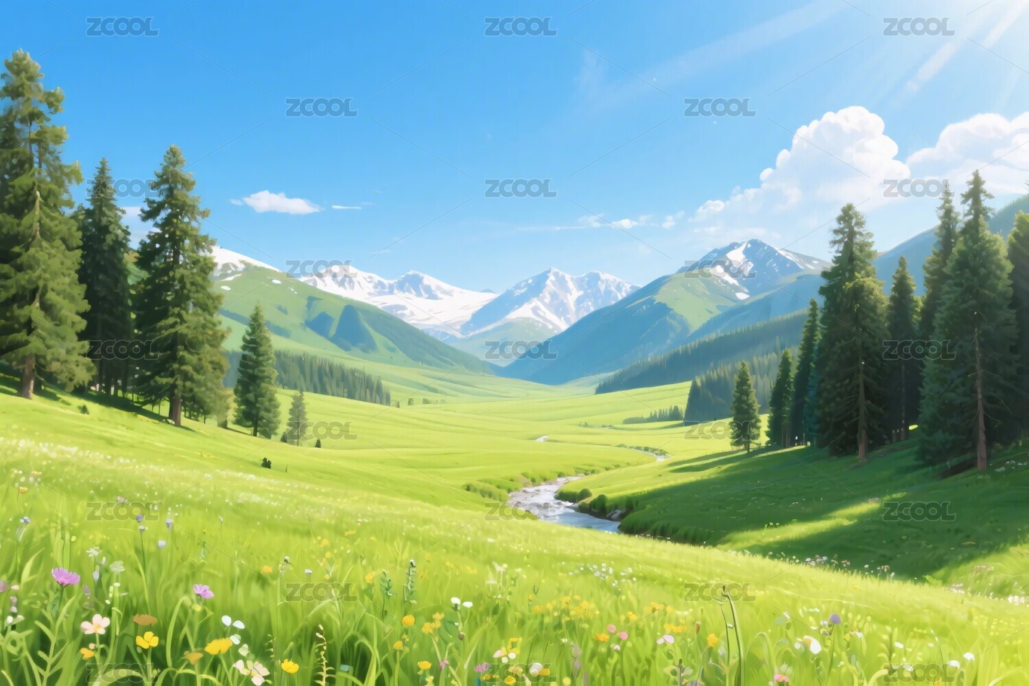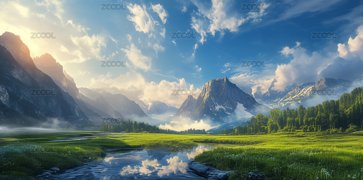自然,宁静,蓝天,山峦,薄雾,绿色,白云,河流,松树,景观