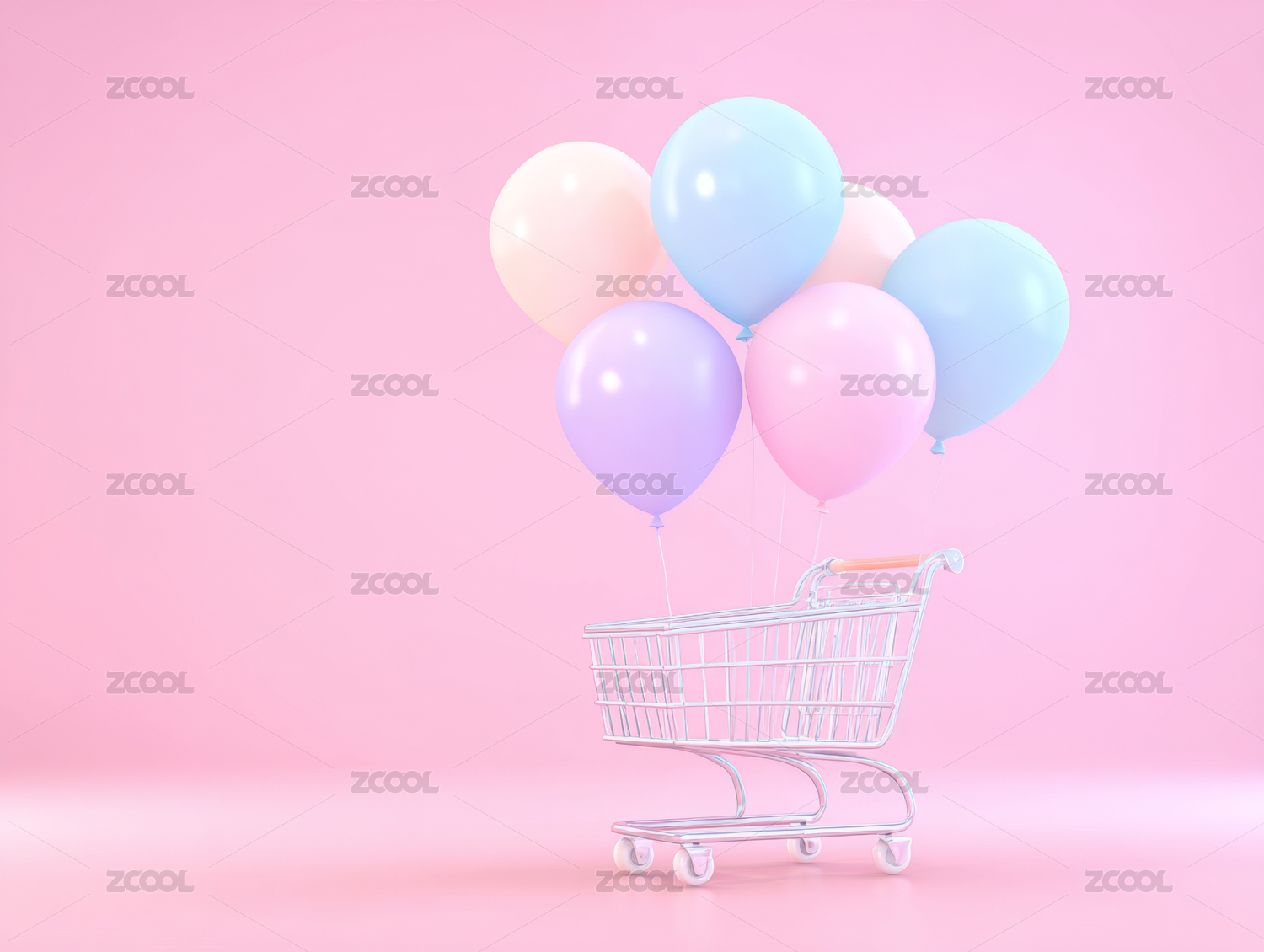 粉红色背景下的心形气球购物车中的气球