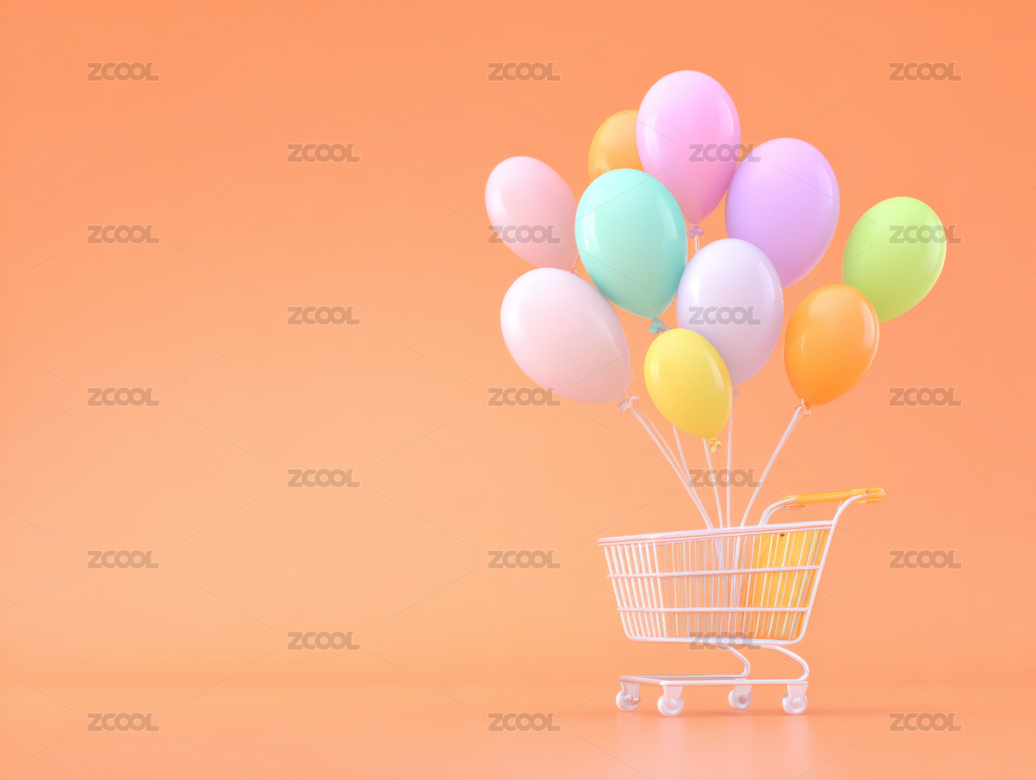 橙色背景下购物车中的彩色气球特写镜头