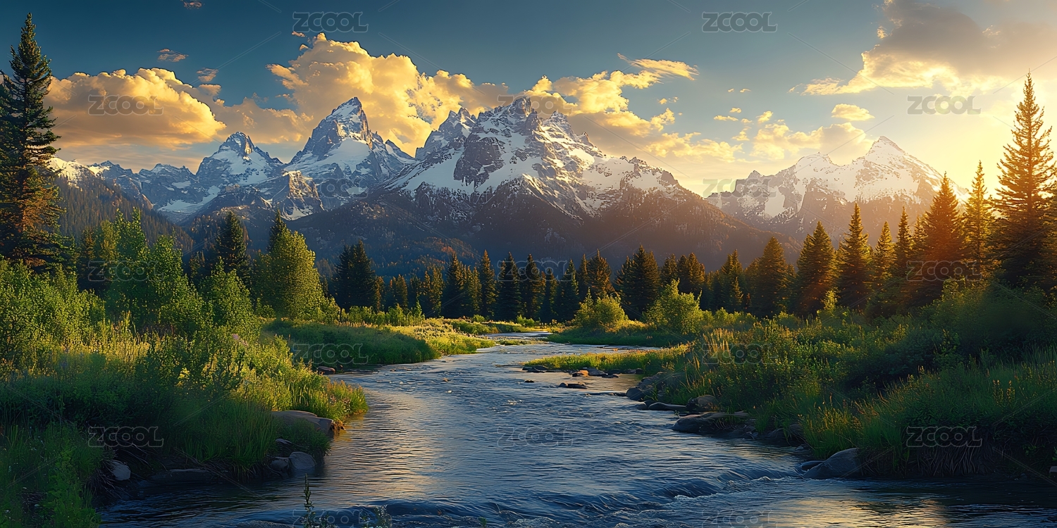 夕阳下溪流雪山草地