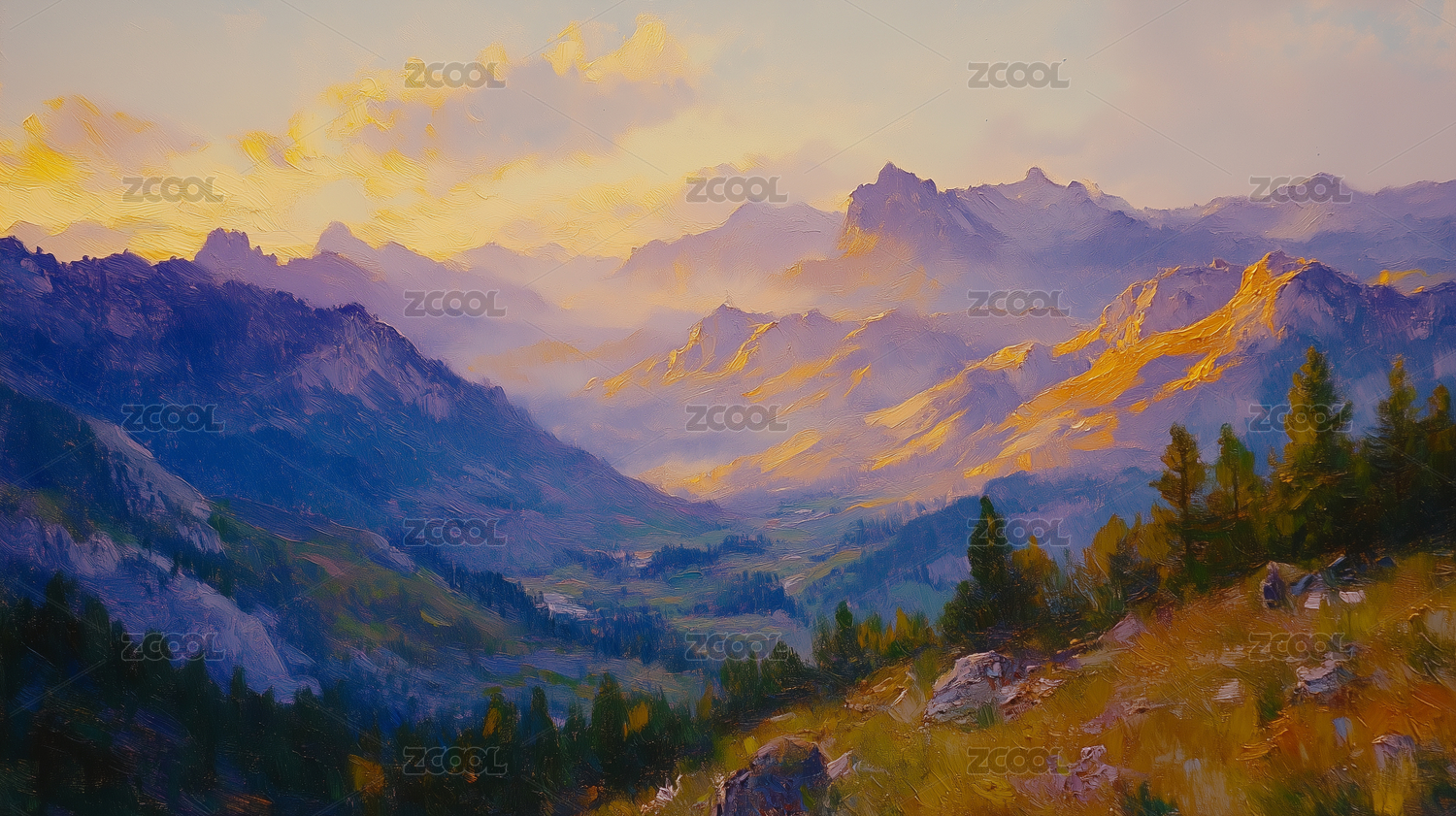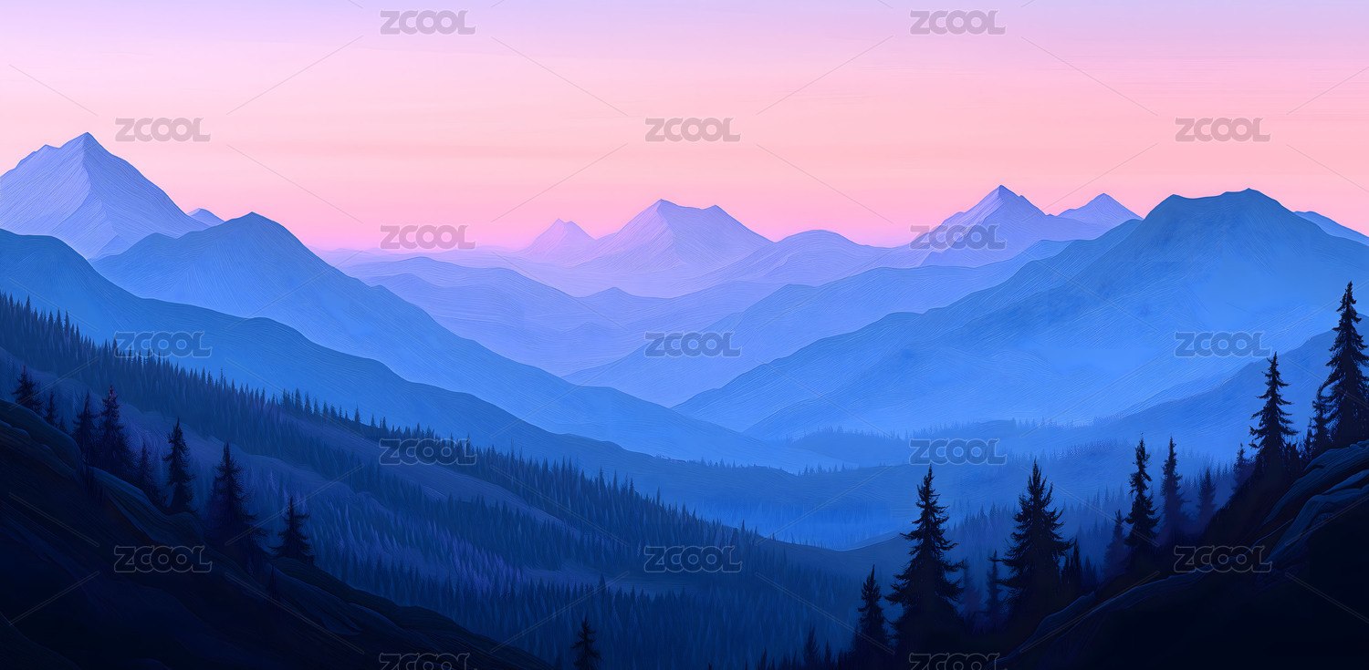 天空,渐变,夕阳,橙色,绿色,山峰,金黄色,植被,树木,广阔