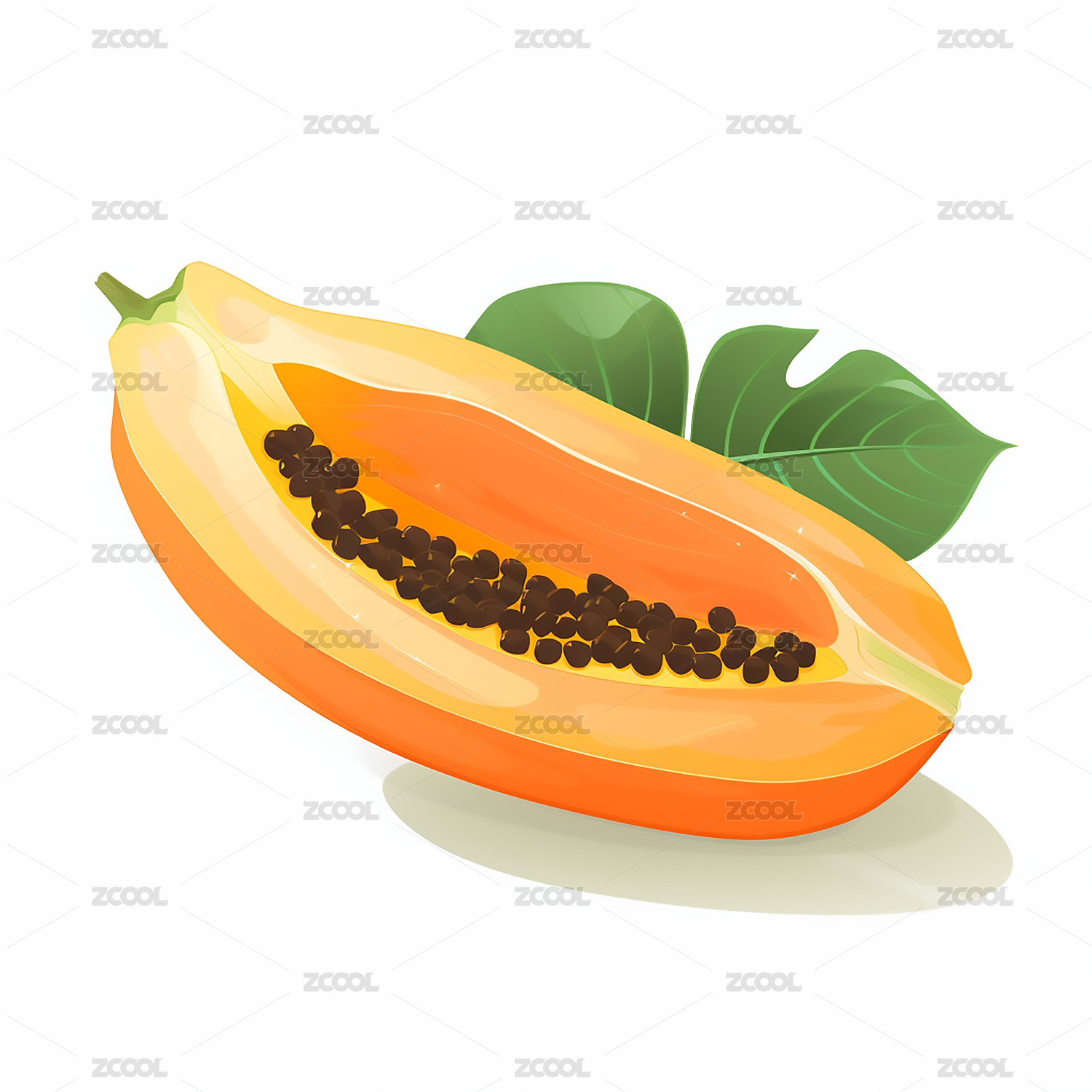 插画,木瓜,水果,橙色,果肉,黑籽,绿叶,手绘,艺术,清新